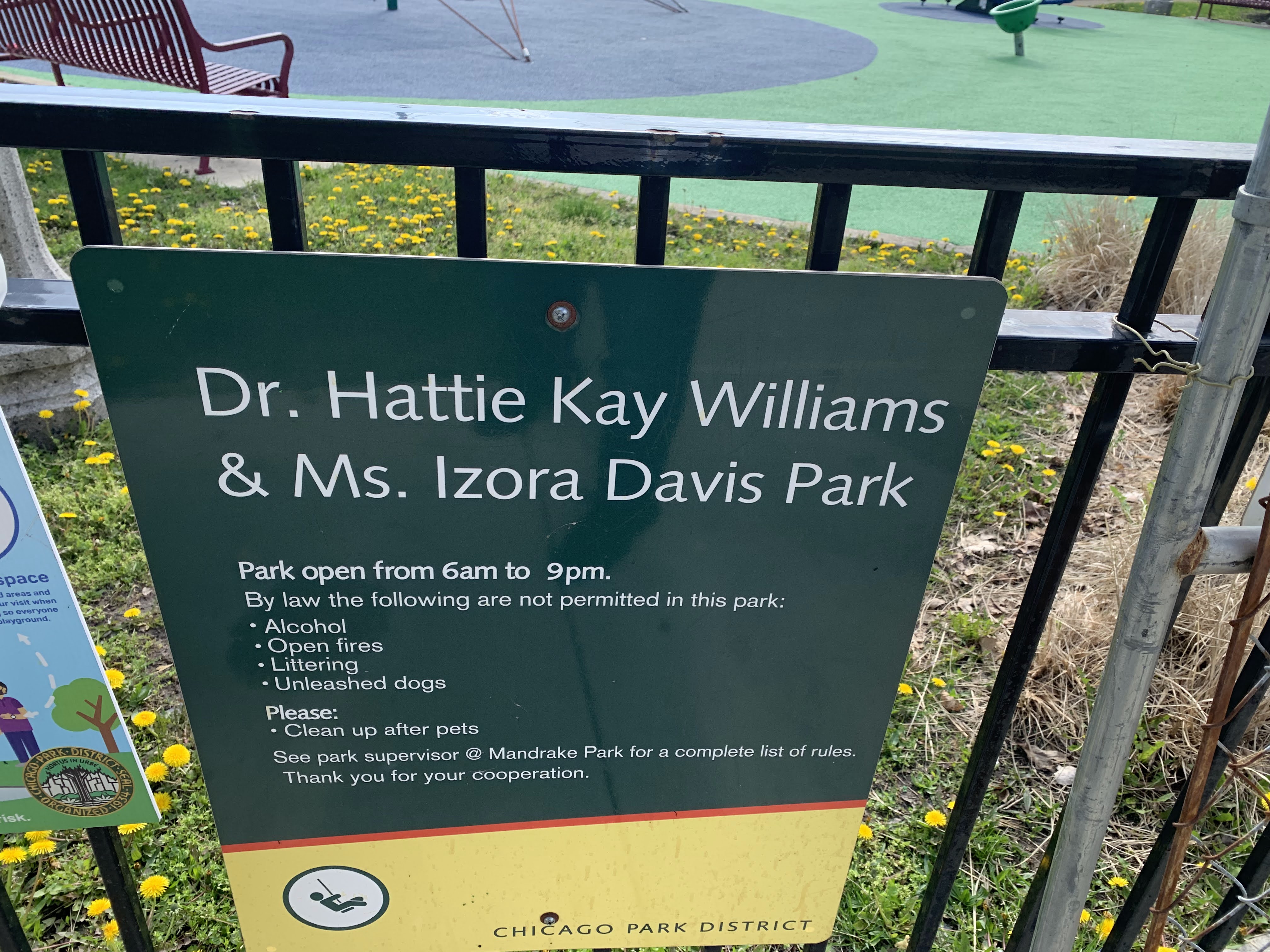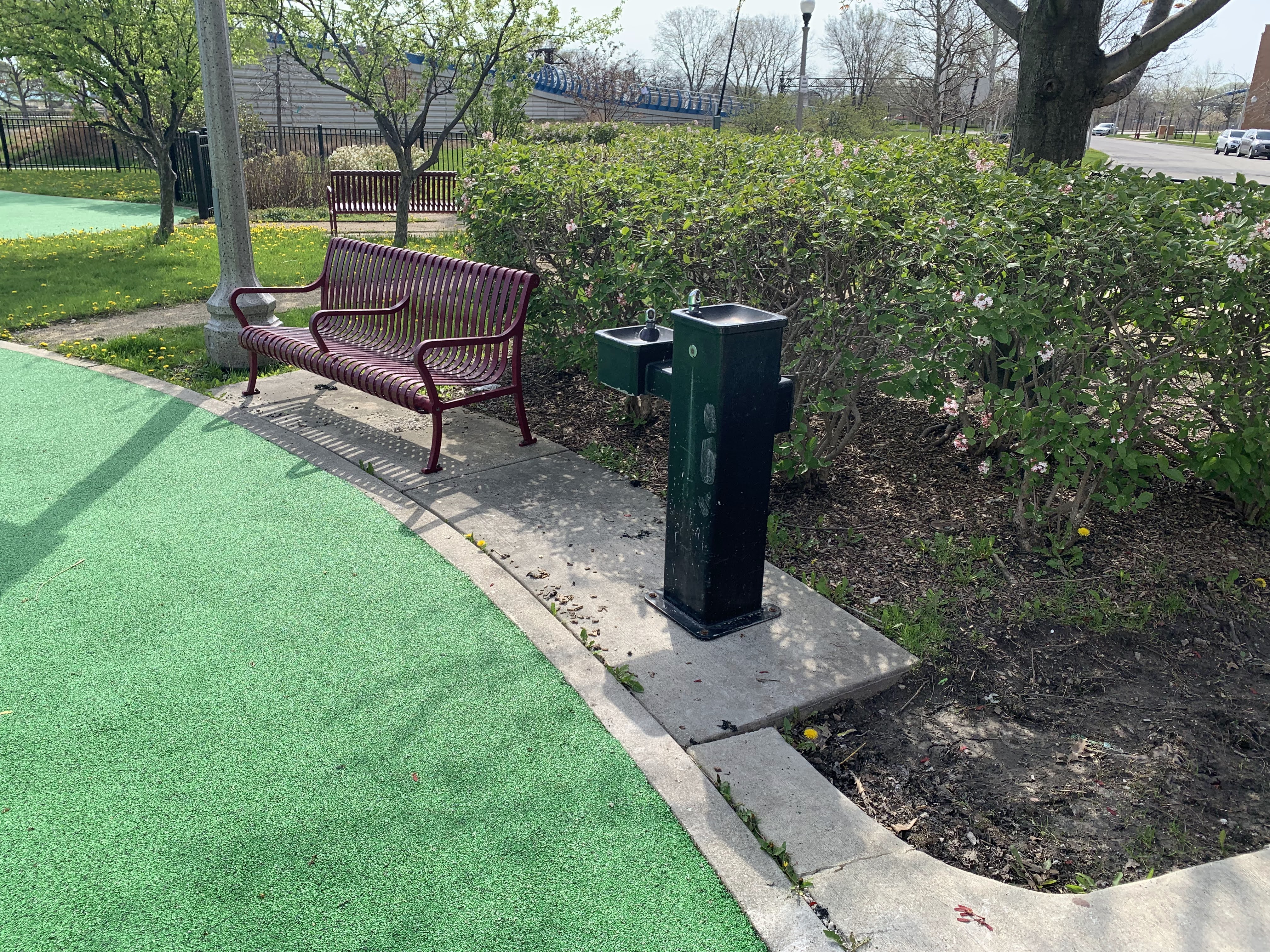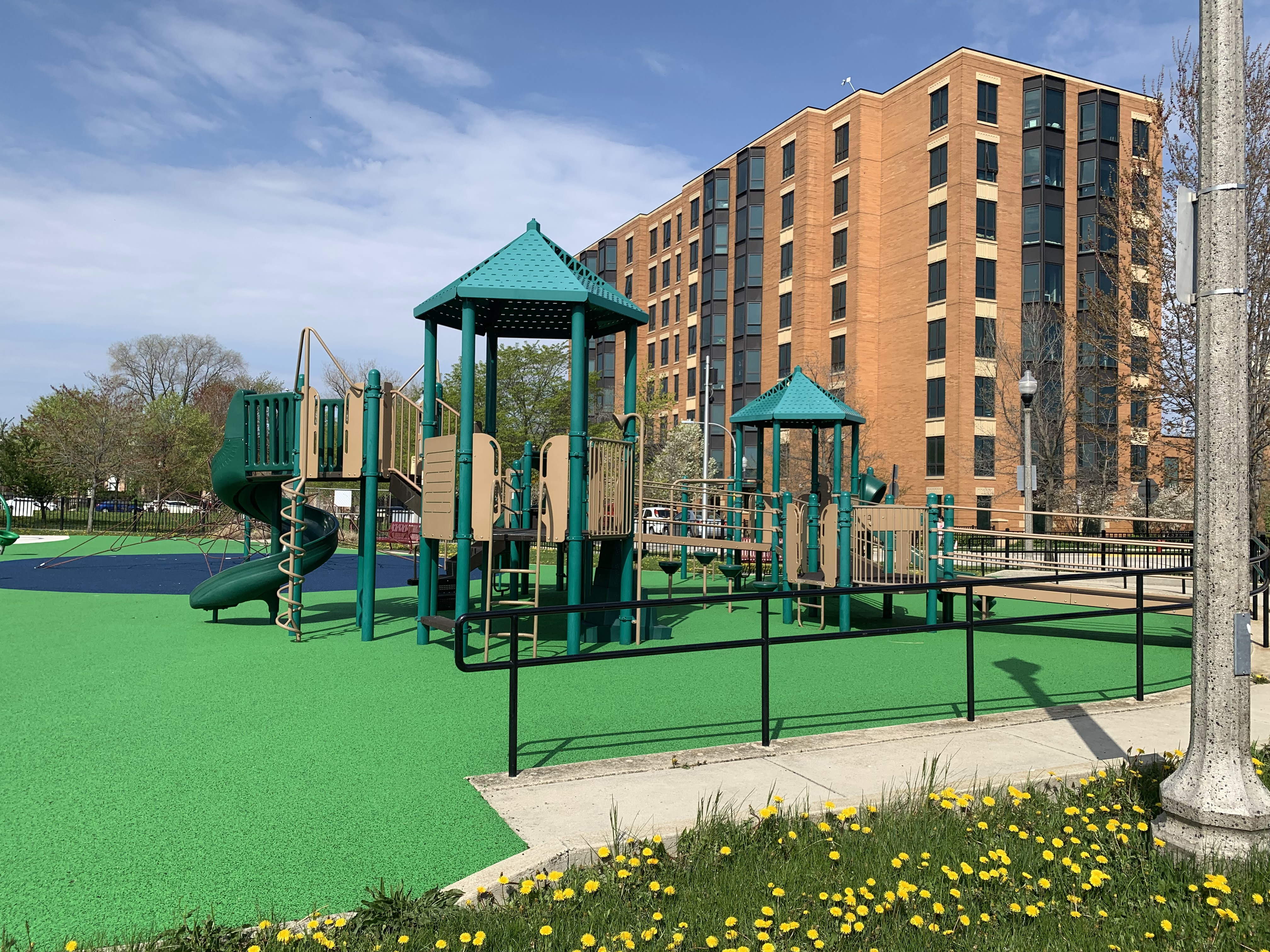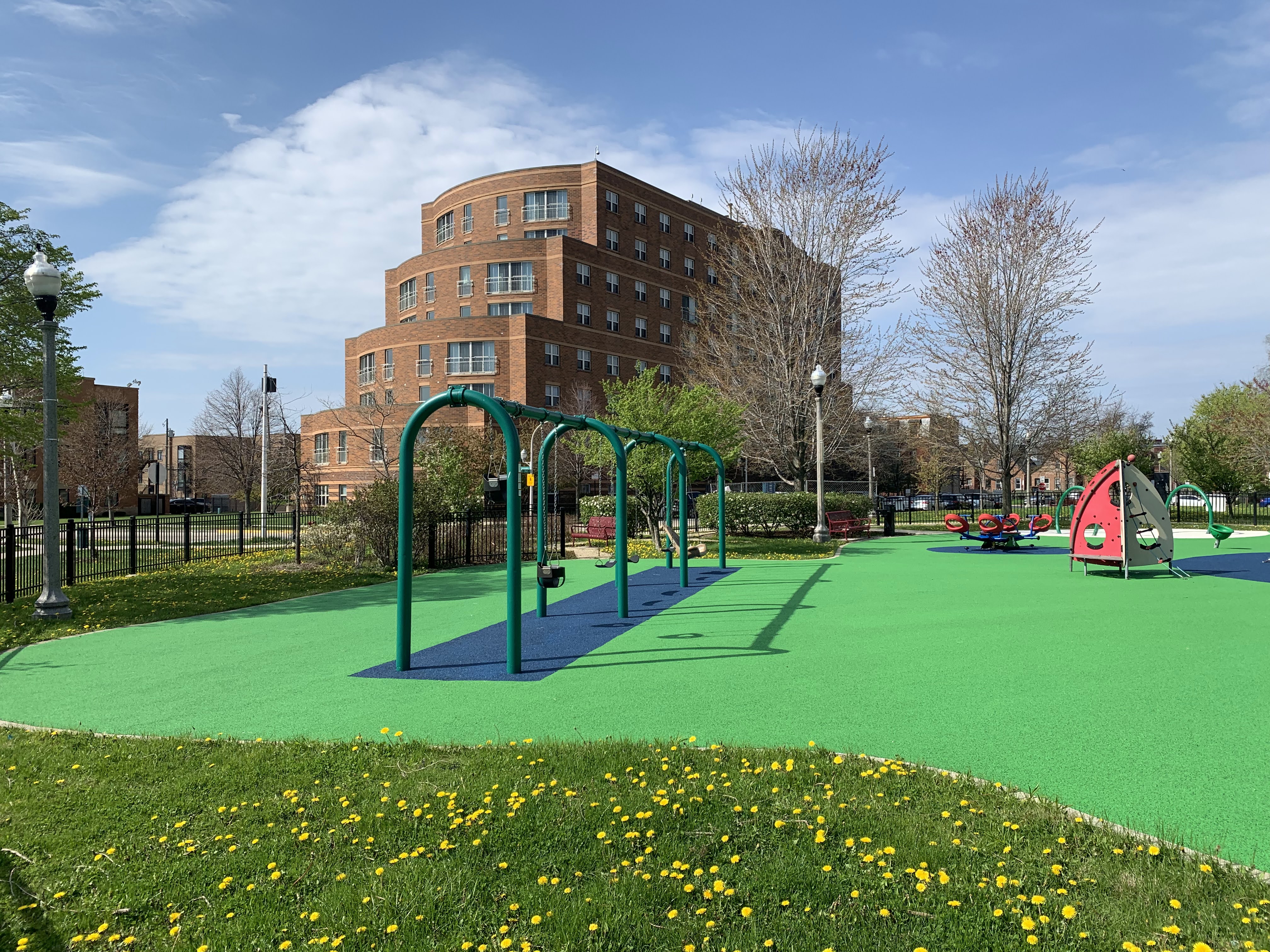 This park - named Williams-Davis Park in honor of Hattie Kay Williams and Izora Davis - contains a wonderful playground at the western edge of the pedestrian footbridge over DuSable Lake Shore Drive. The main play structure is quite large and features a number of slides and climbing elements and interactive panels. It is also accessible via a ramp for those using wheelchairs or in strollers. There are also a number of interesting standalone features: a single mast net climbing structure, a somewhat abstract climbing structure, a spinning bowl, and a large see-saw. There is also a standard set of park district swings. In the same play area is a water spray feature with two water loops and some jets from the ground.