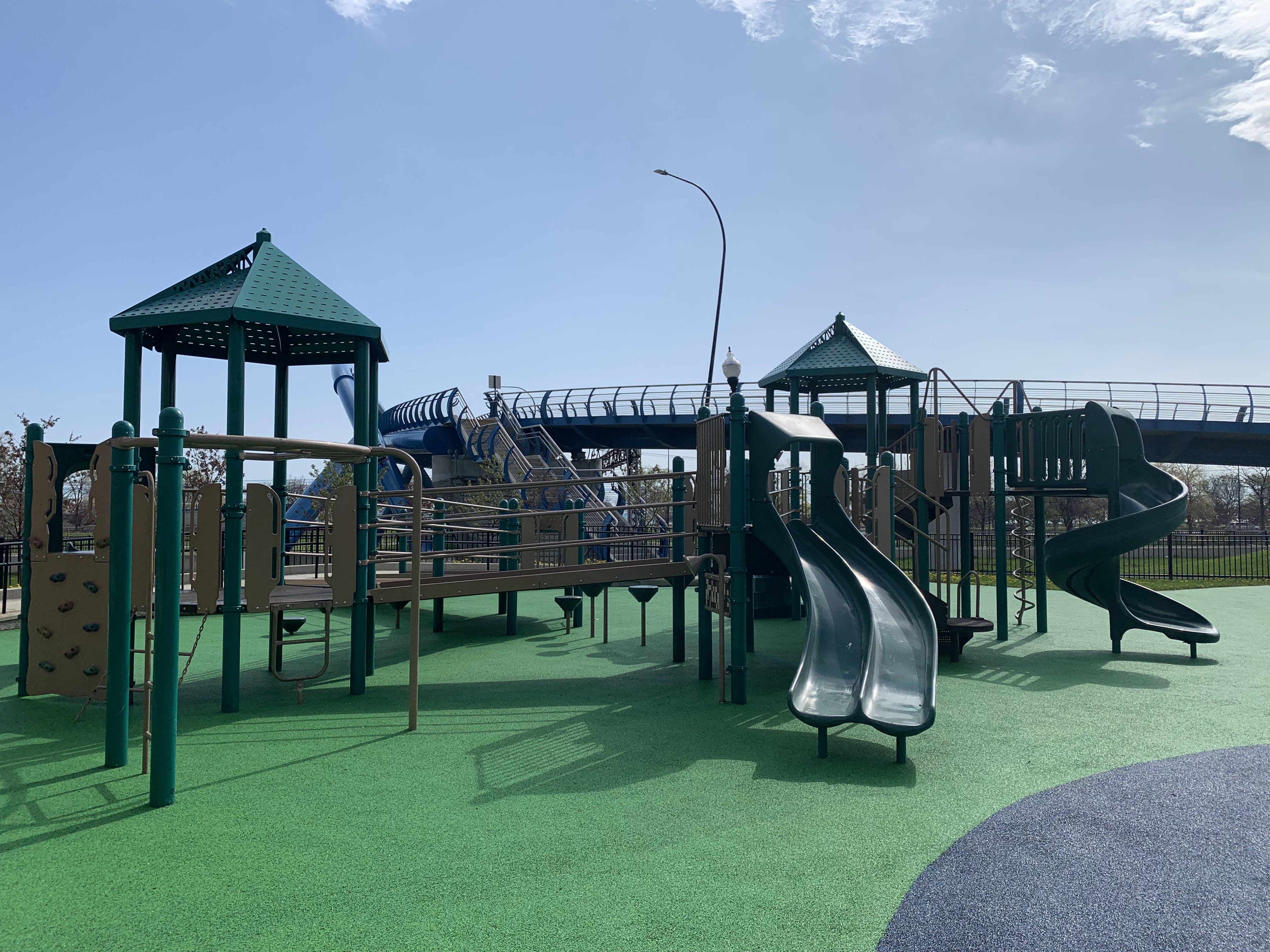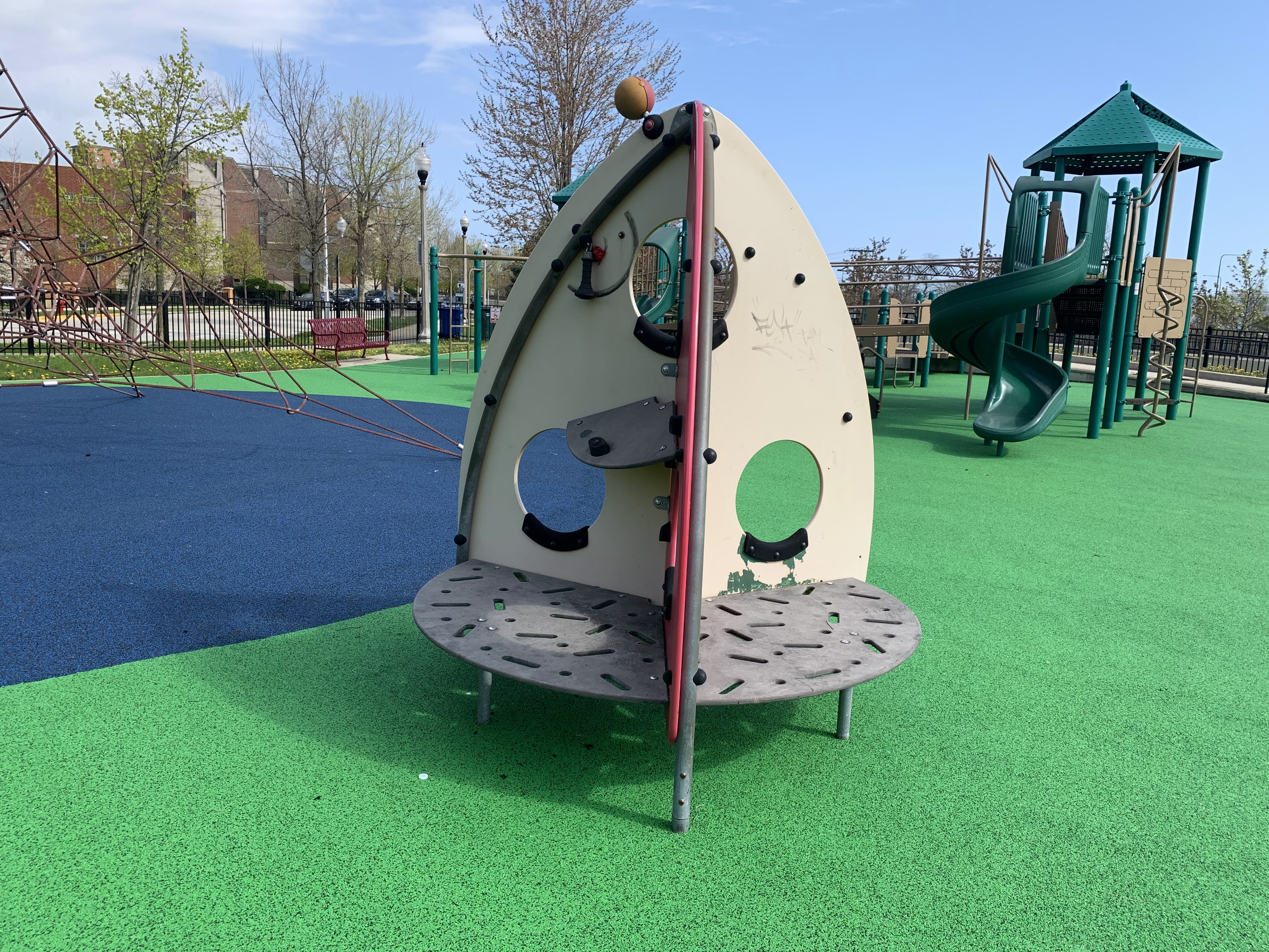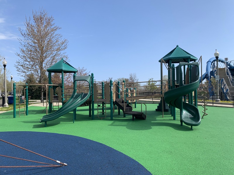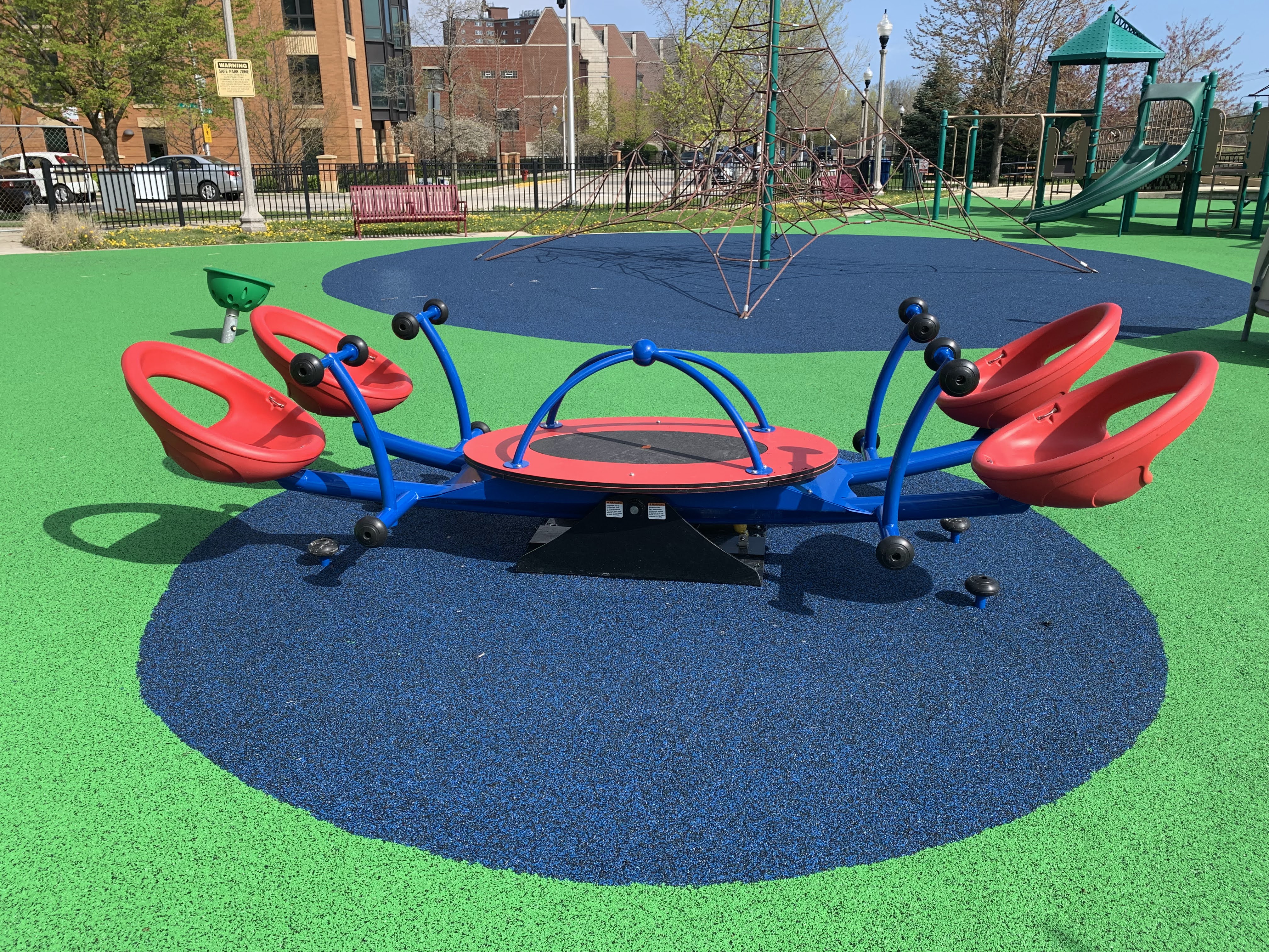 The play area is fully enclosed and the play surface is soft rubber. There are a number of benches in the play area and a few picnic tables just outside the enclosed area. While there is a drinking fountain, there is not much shade for this playground and it remains bright and sunny most of the day. All in all, this is a wonderful playground; highly recommend. - Playground Features