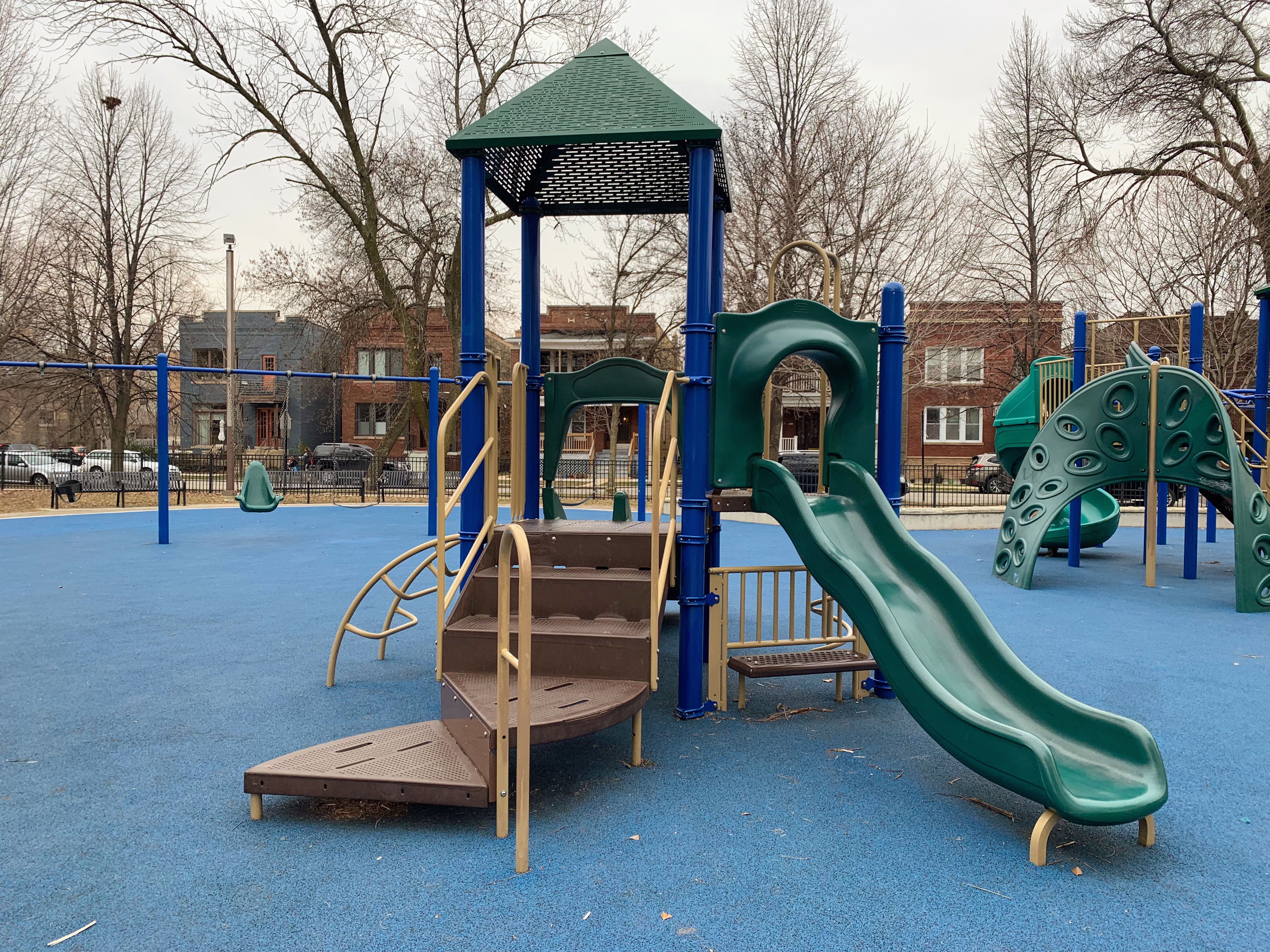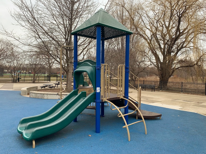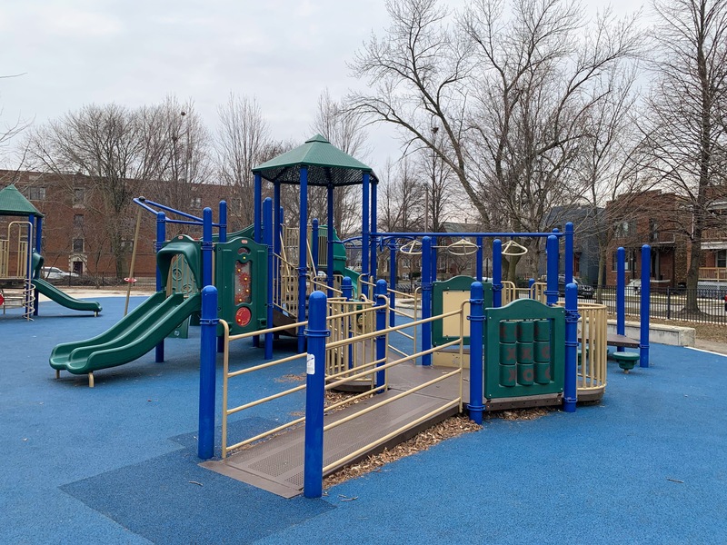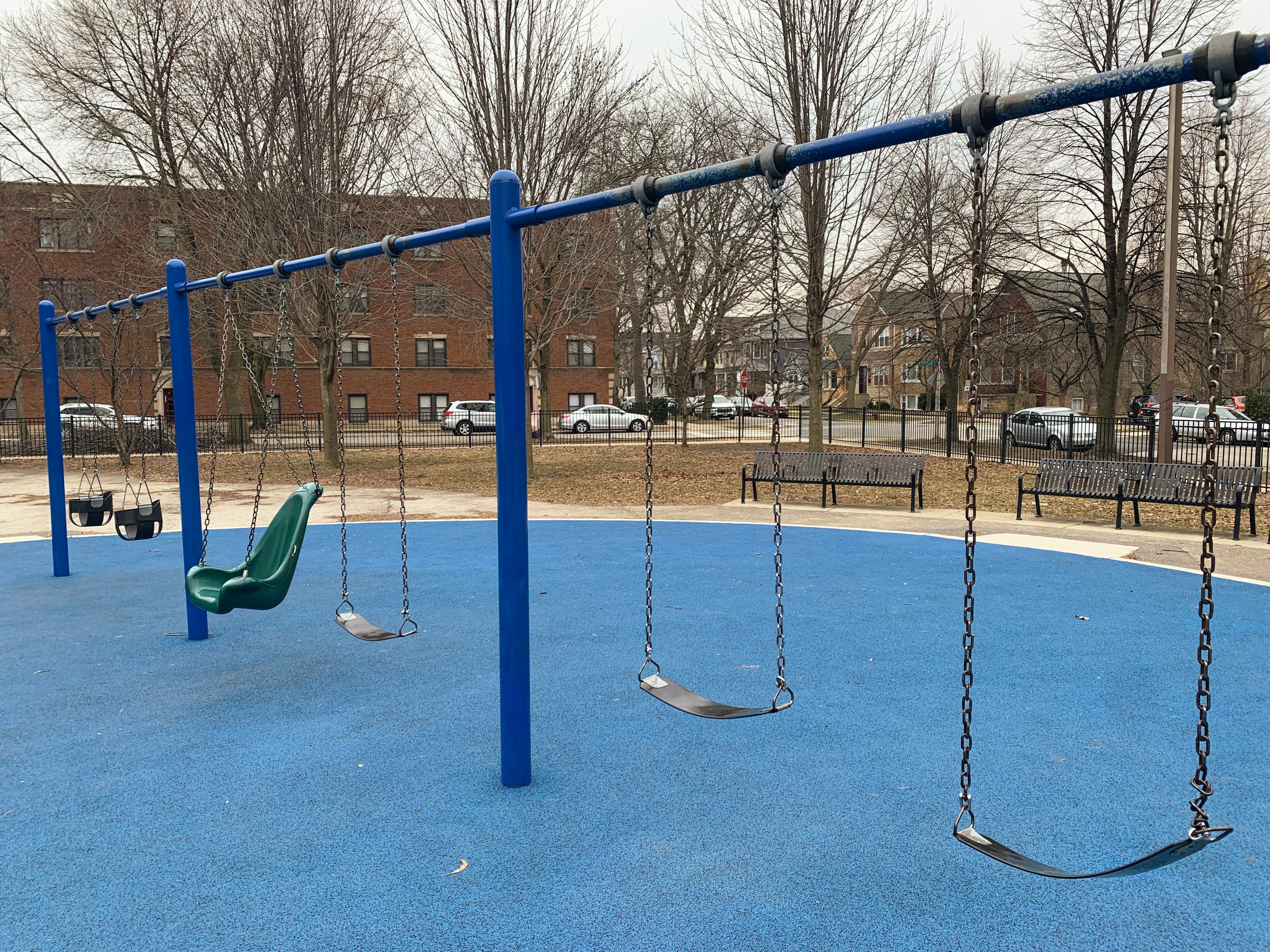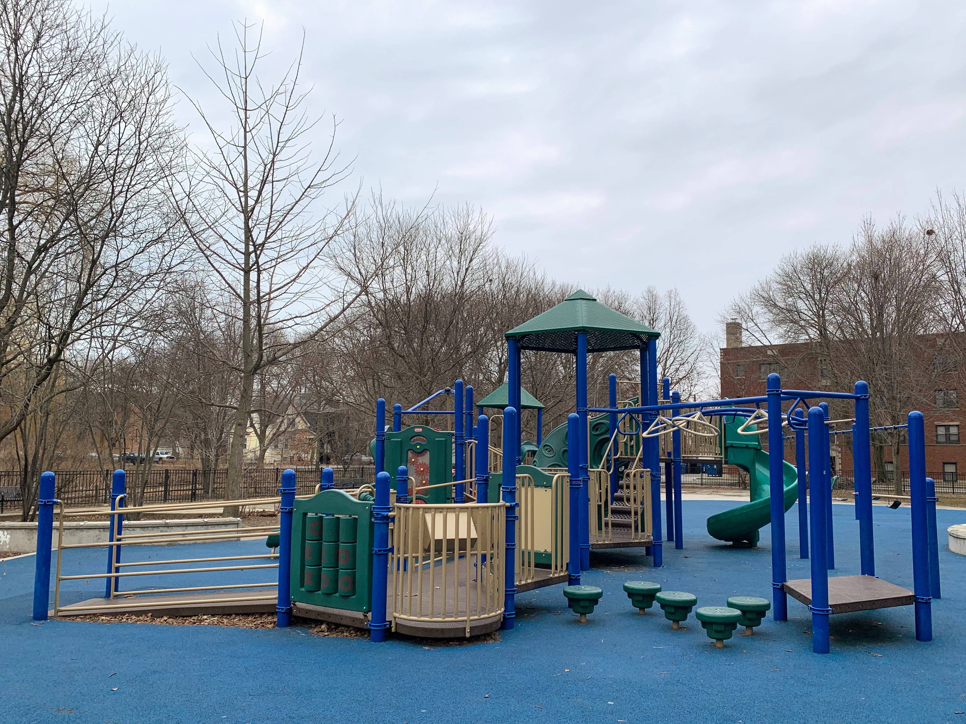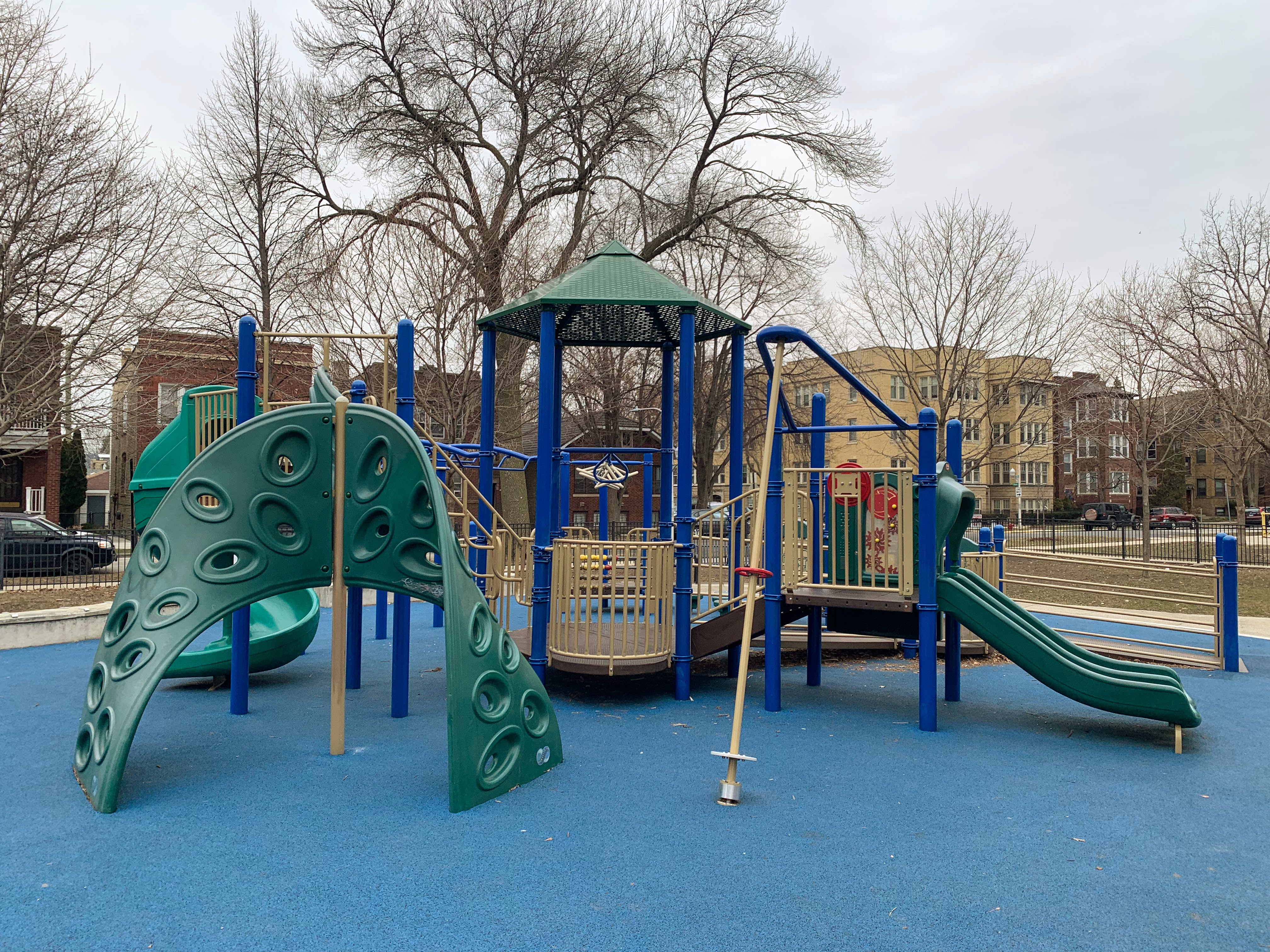 - Located in the southwest corner of Winnemac Park, this playground has lots of play structures and other amenities. There is a larger play structure for older children, a smaller play structure for younger children, and the standard set of swings. The play area is quite large and fully enclosed and uses a combination of soft rubber, concrete, and grass as the play surface. Mature trees on all sides provide spots of shade throughout the day and there are benches and picnic tables within the play area. In total, these features and amenities make this a wonderful and popular playground.