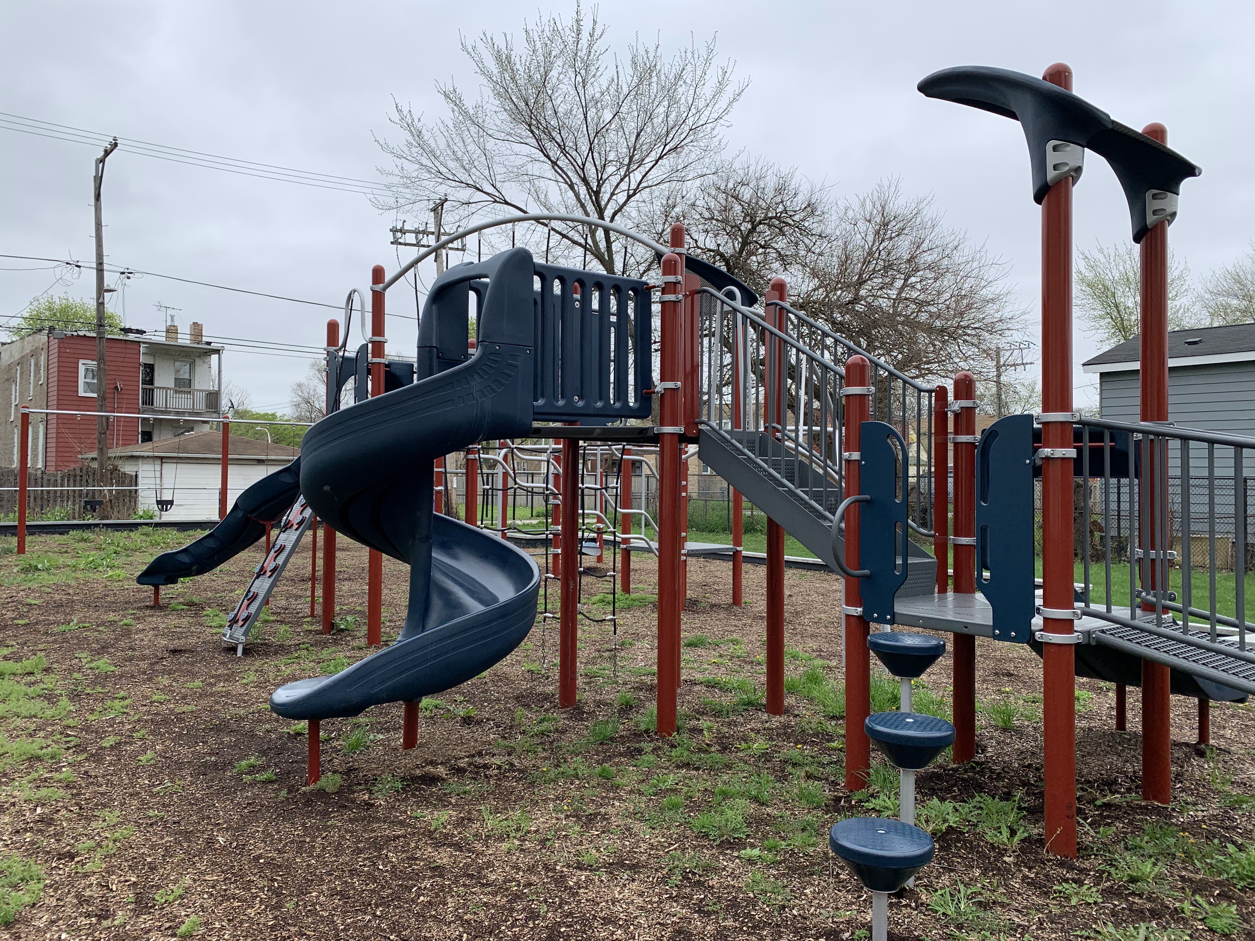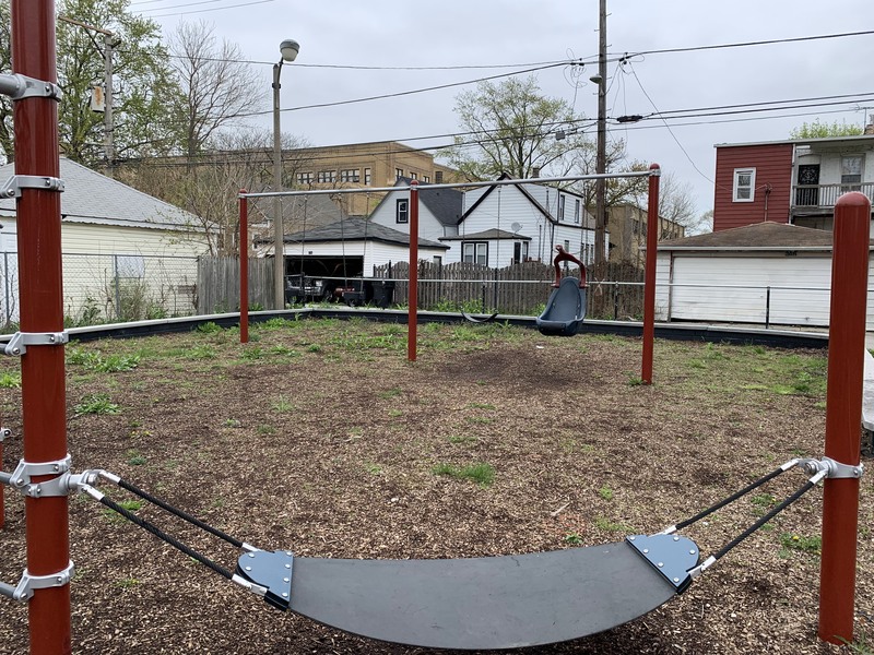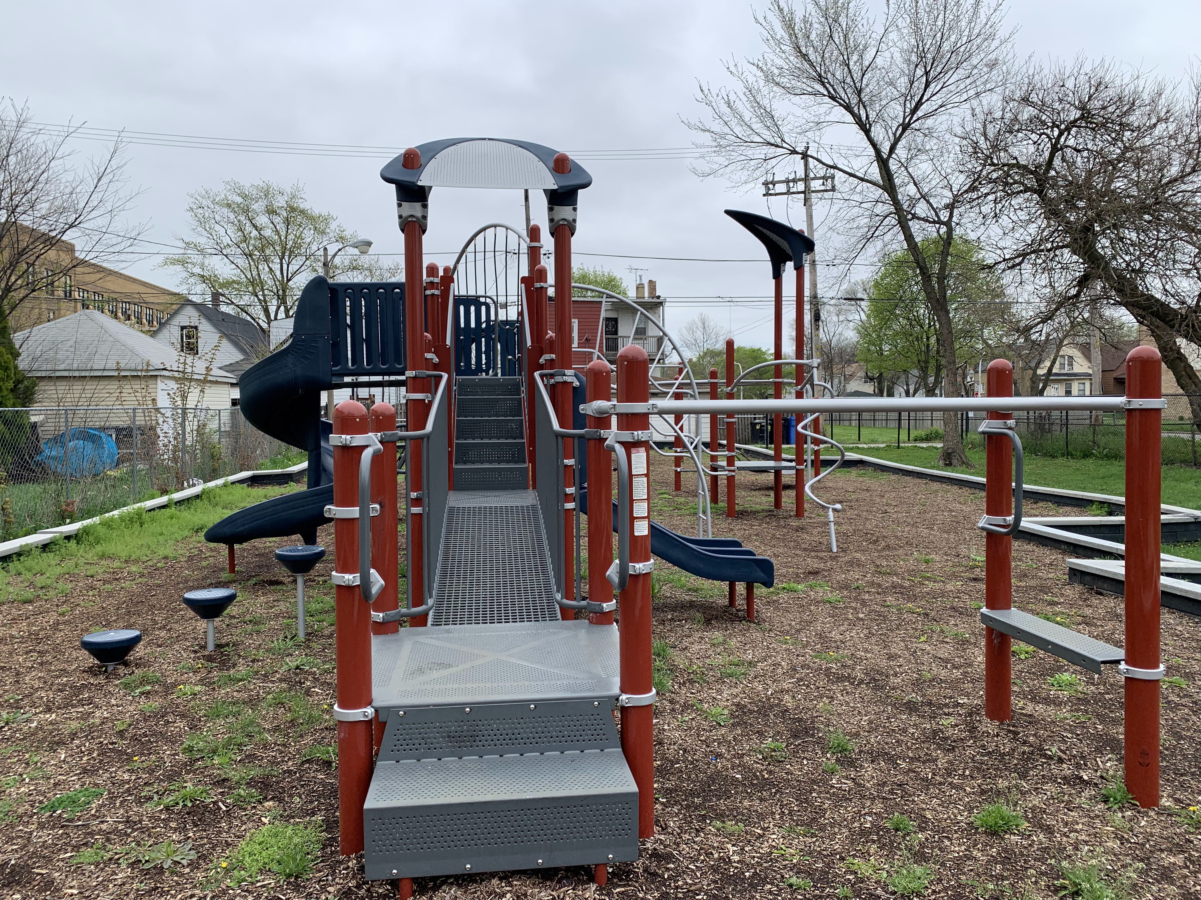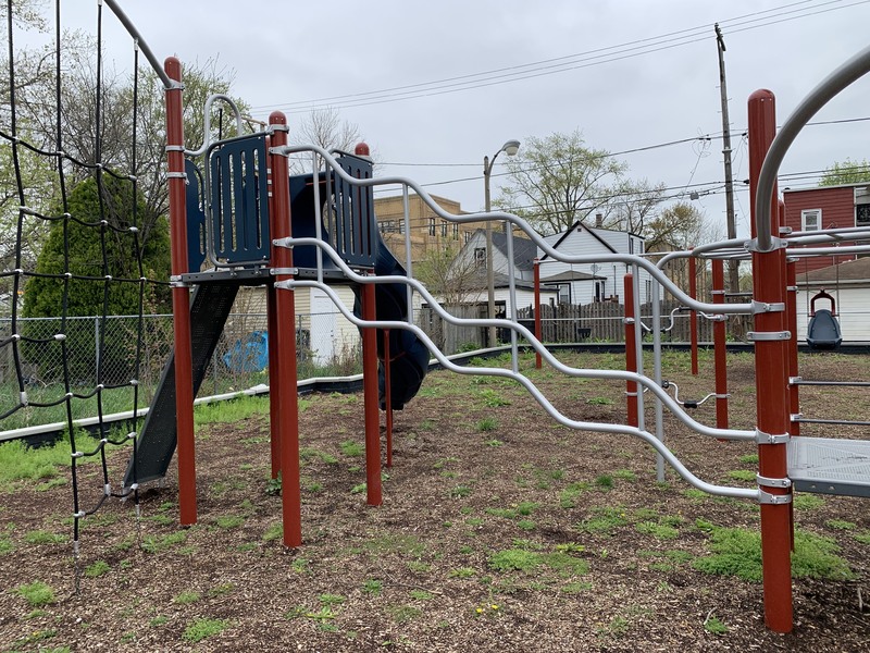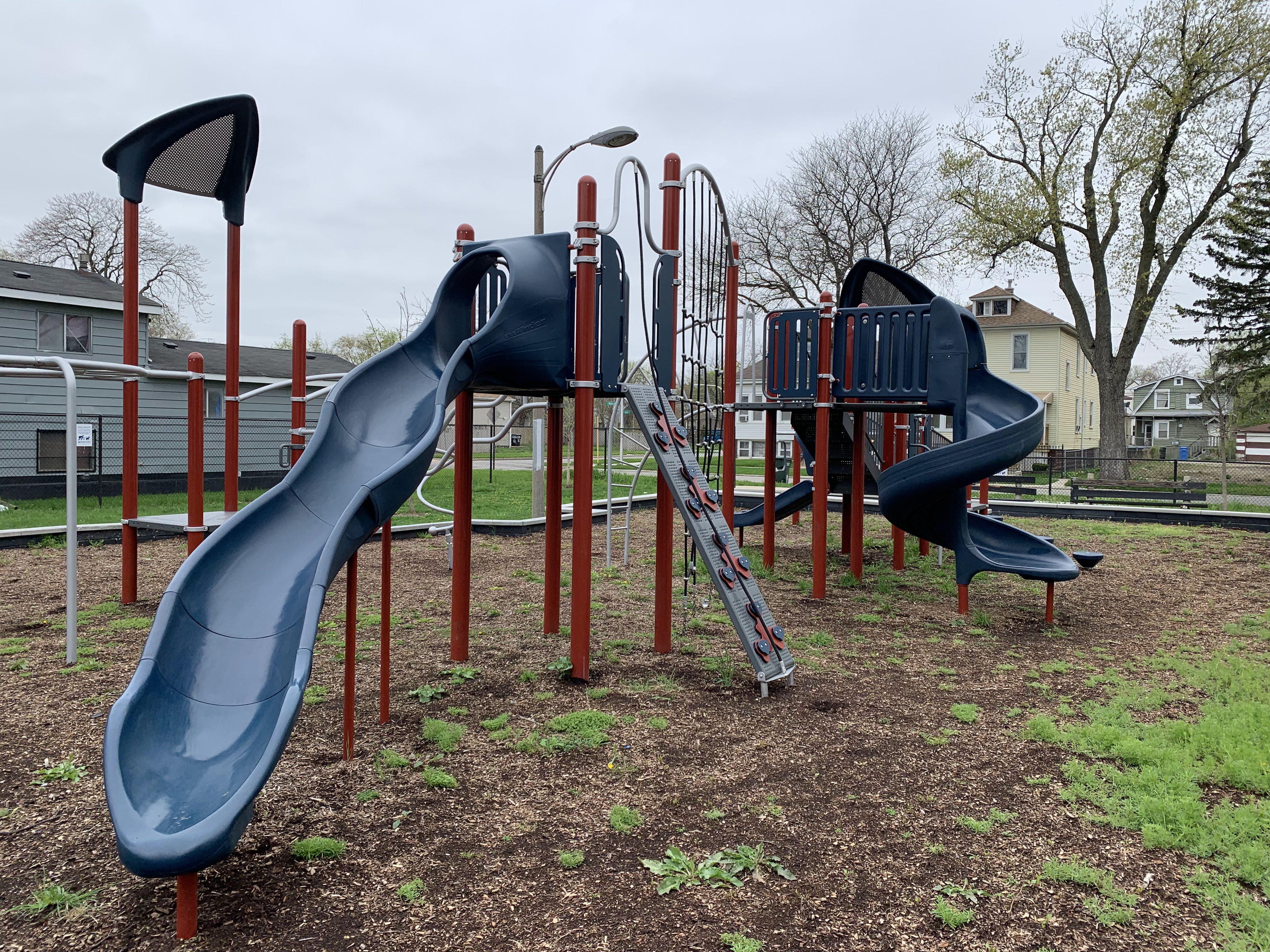 - Wolcott Park is a tiny neighborhood pocket park that contains a large playground structure and a set of swings. The structure includes a few slides and climbing elements as well as a circular monkey bars and a large metal traverse. The play ground is fenced but not fully enclosed and there is a drinking fountain and a few benches near the main entrance. The play surface is wood chips and the park get full sun most of the day.