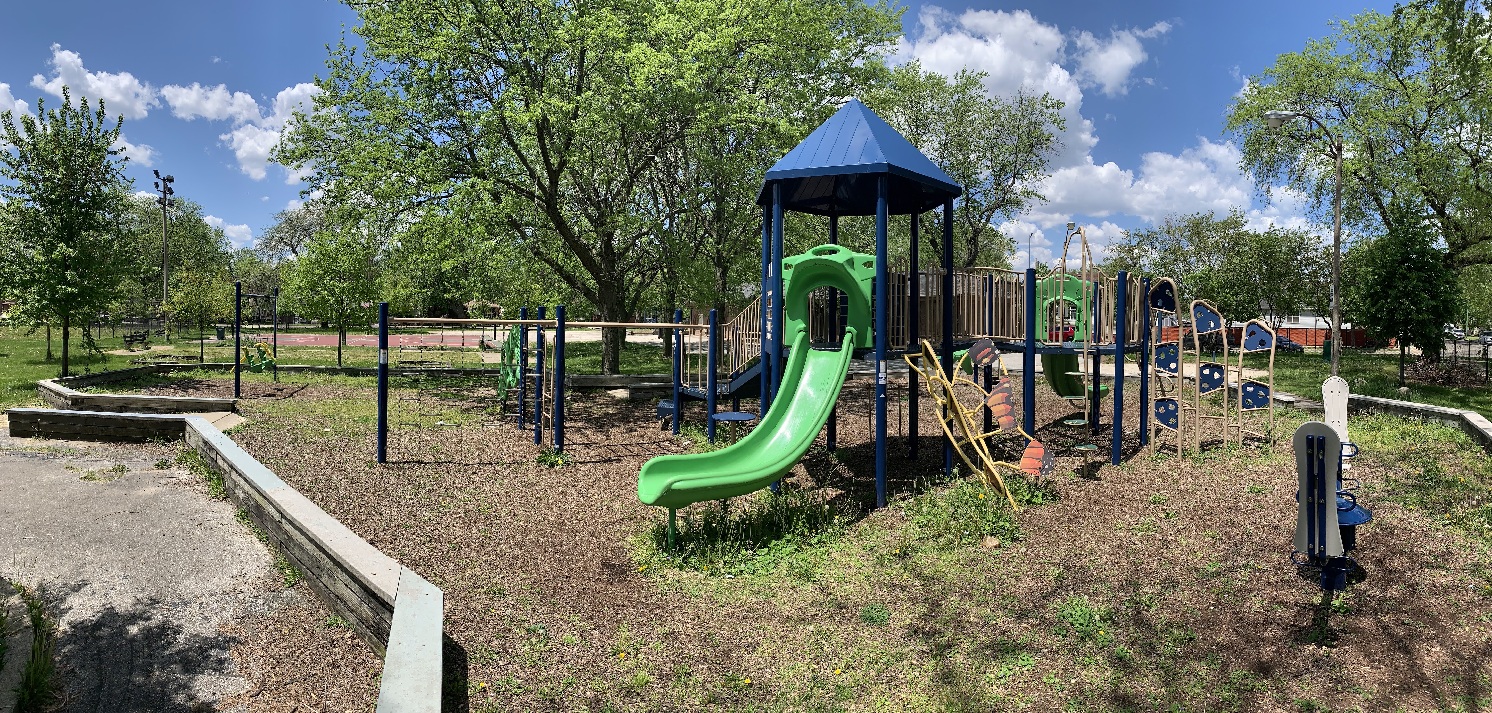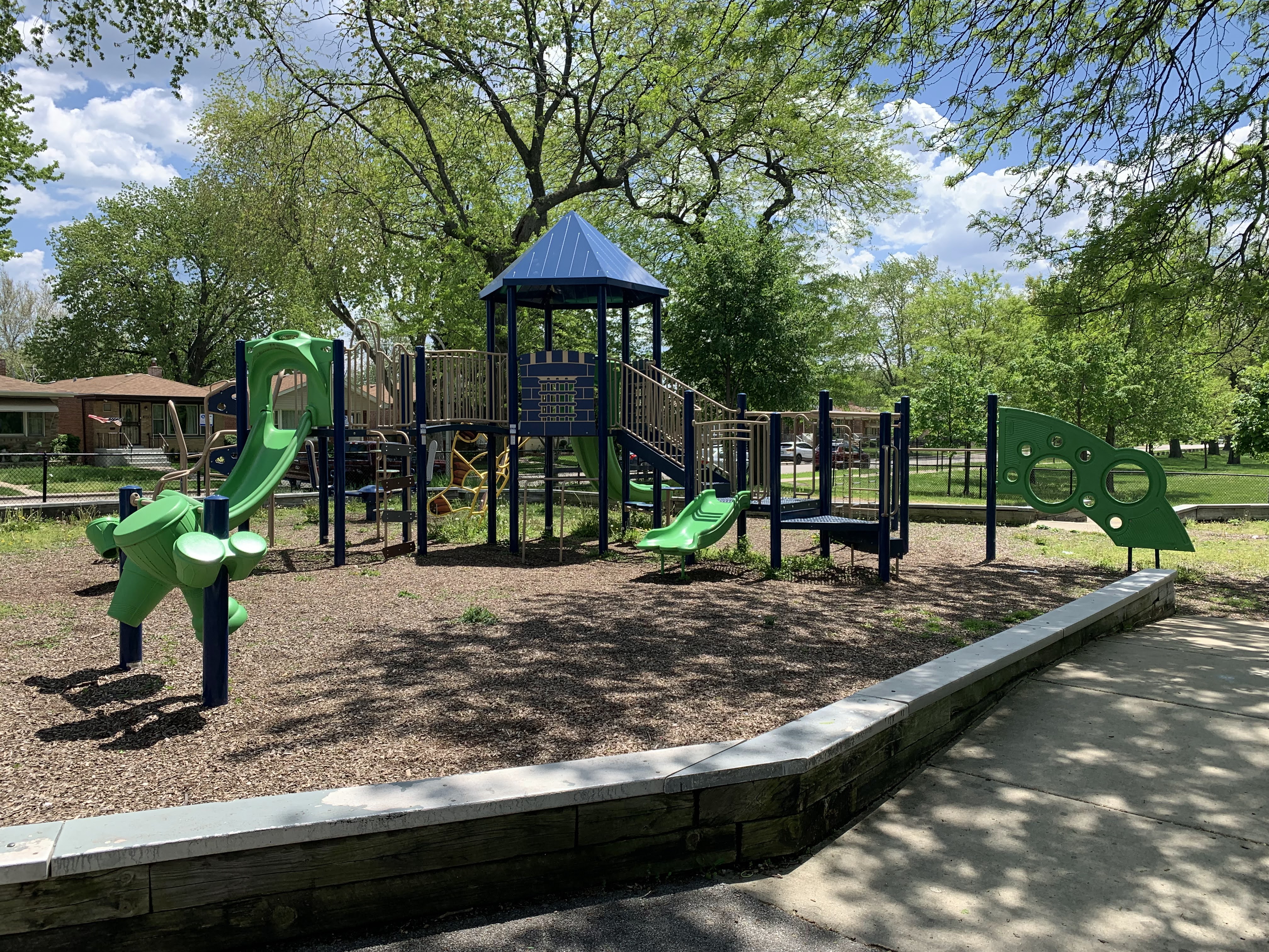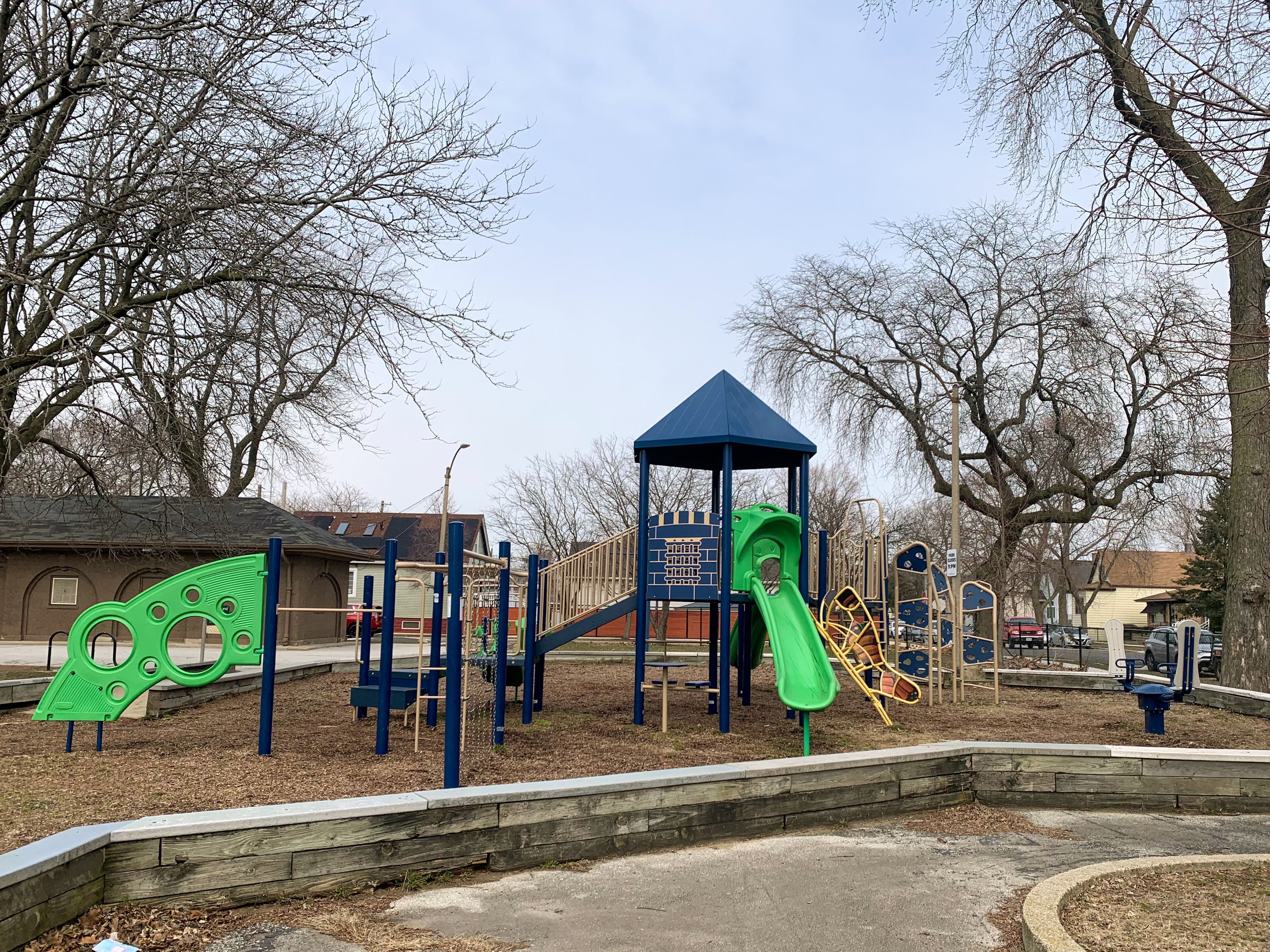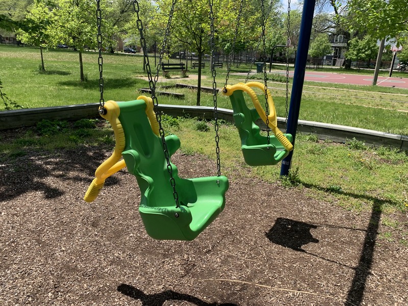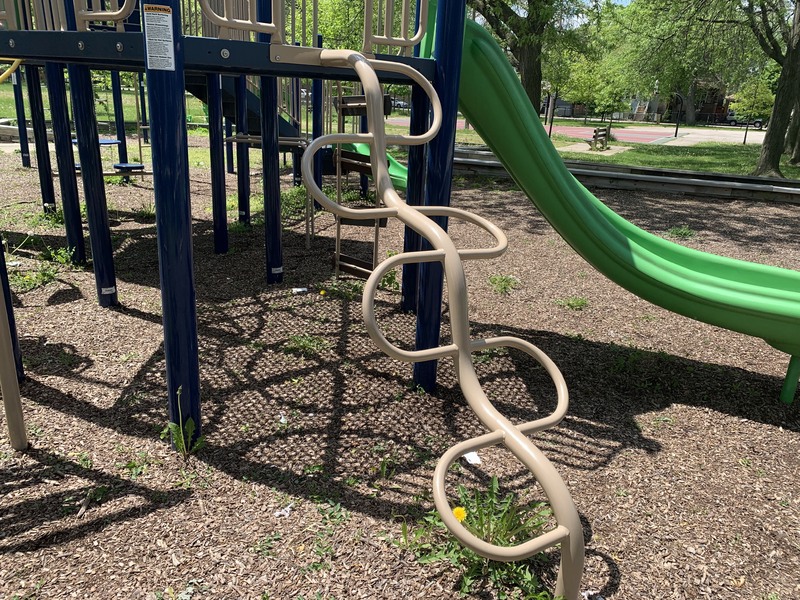- The playground in Wolfe Park contains a small play structure, a set of swings, and a small water feature. The single play structure is quite large and includes a few slides and some unique climbing features. There are also a few climbing, traversing, and overhead elements next to the main structure as well as a standalone see-saw in the area. There is a small set of two adaptive swings in the same area and - curiously - a set of belt seat swings and toddler swings on the other side of the fieldhouse in the northwest corner of the park. The water spray feature is a simple "overhead triple sprayer" that was renovated in 2015 with the rest of the playground. The play area is fenced from the street but not fully enclosed and the surface is wood chips. There are a few benches nearby but the low perimeter wall provides some informal seating. Large trees provide some afternoon shade the the fieldhouse should provide bathroom access when open.