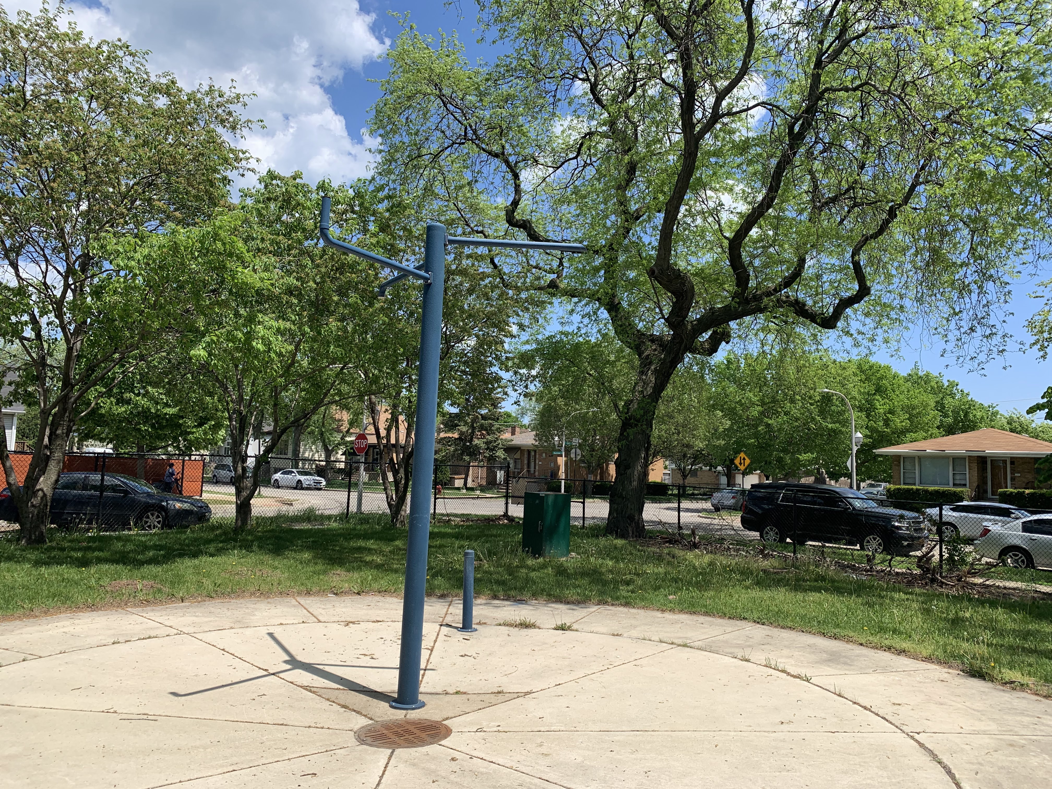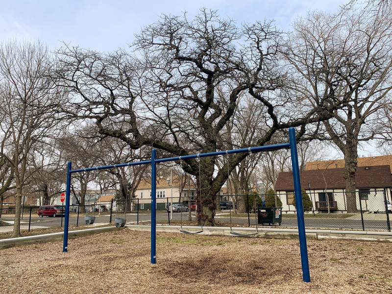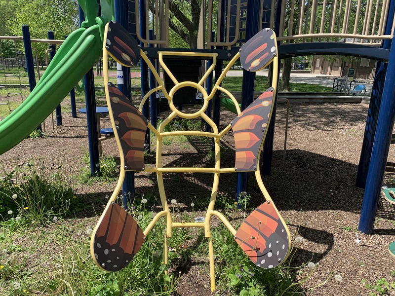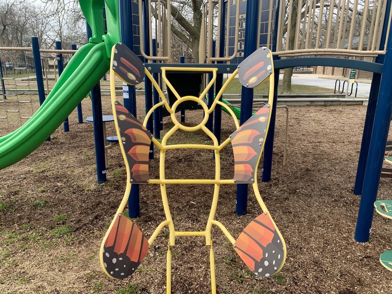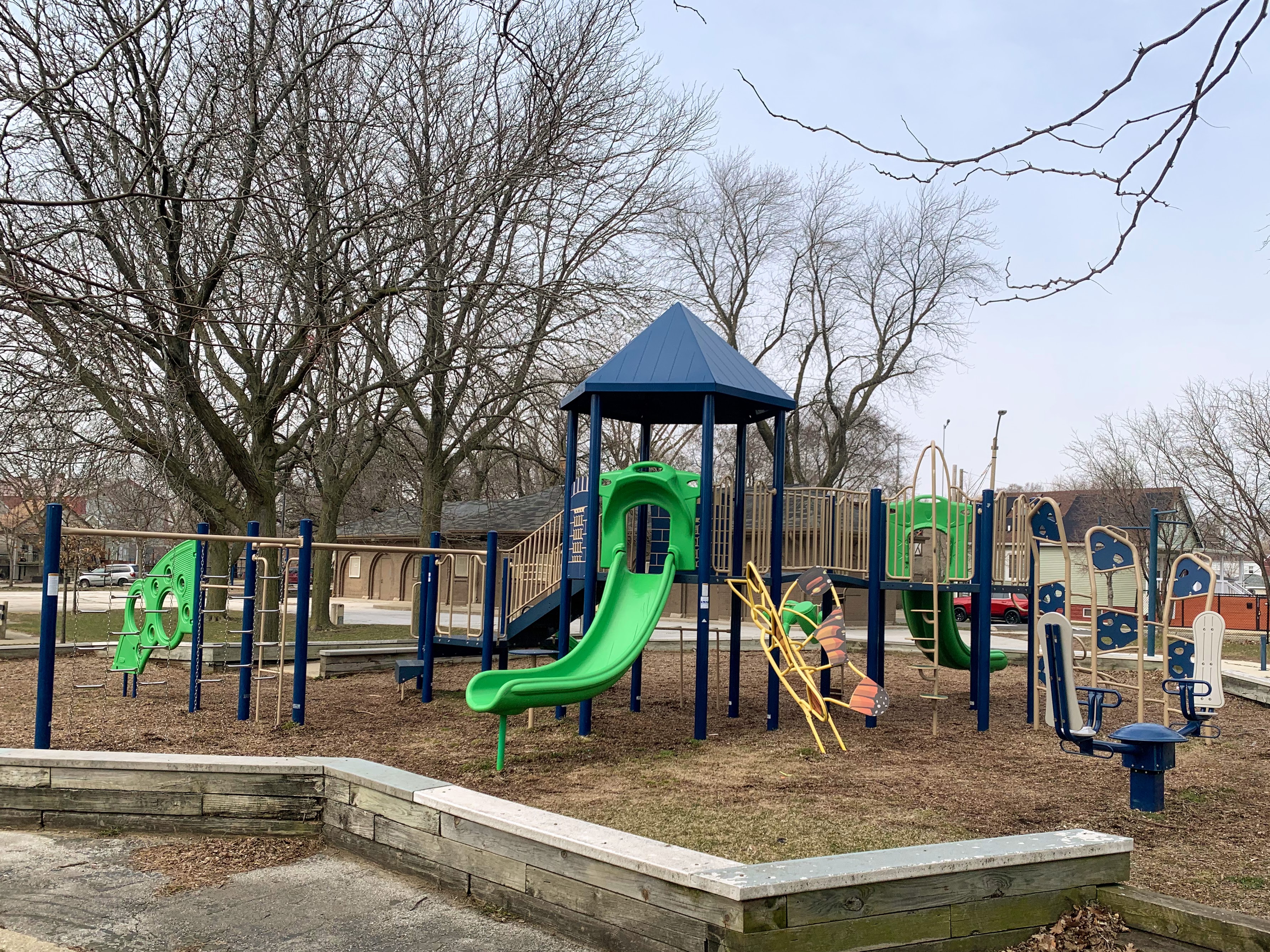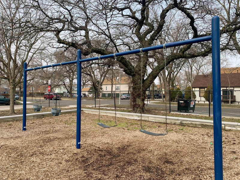 - The playground in Wolfe Park contains a small play structure, a set of swings, and a small water feature. The single play structure is quite large and includes a few slides and some unique climbing features. There are also a few climbing, traversing, and overhead elements next to the main structure as well as a standalone see-saw in the area. There is a small set of two adaptive swings in the same area and - curiously - a set of belt seat swings and toddler swings on the other side of the fieldhouse in the northwest corner of the park. The water spray feature is a simple "overhead triple sprayer" that was renovated in 2015 with the rest of the playground. The play area is fenced from the street but not fully enclosed and the surface is wood chips. There are a few benches nearby but the low perimeter wall provides some informal seating. Large trees provide some afternoon shade the the fieldhouse should provide bathroom access when open.