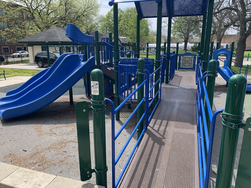 - The playground at Woodhull Park is located in the northeast corner of the park and features two play structures and a small water feature. The smaller structure is designed for younger children and includes a few slides and climbing elements. The larger structure also includes slides as well as a variety of climbing elements with monkey bars and other traversing elements attached. Most platforms of this structure are also accessible via a ramp and the main surface is soft rubber making this play structure somewhat accessible. The water spray feature nearby is small and features a single bent pole water sprayer. The area is fenced from the street but not fully enclosed. There are a few benches and trees for seating and shade.