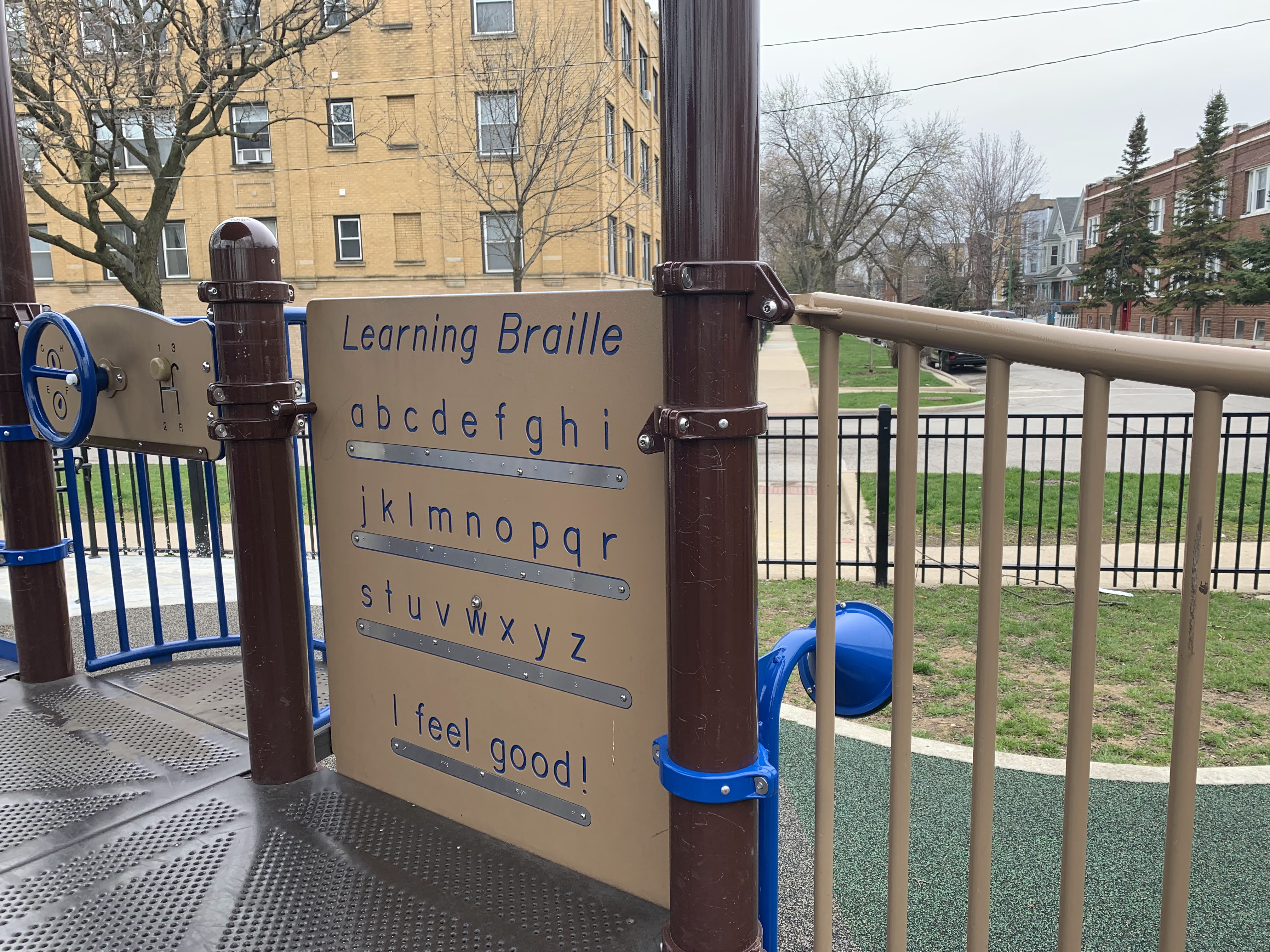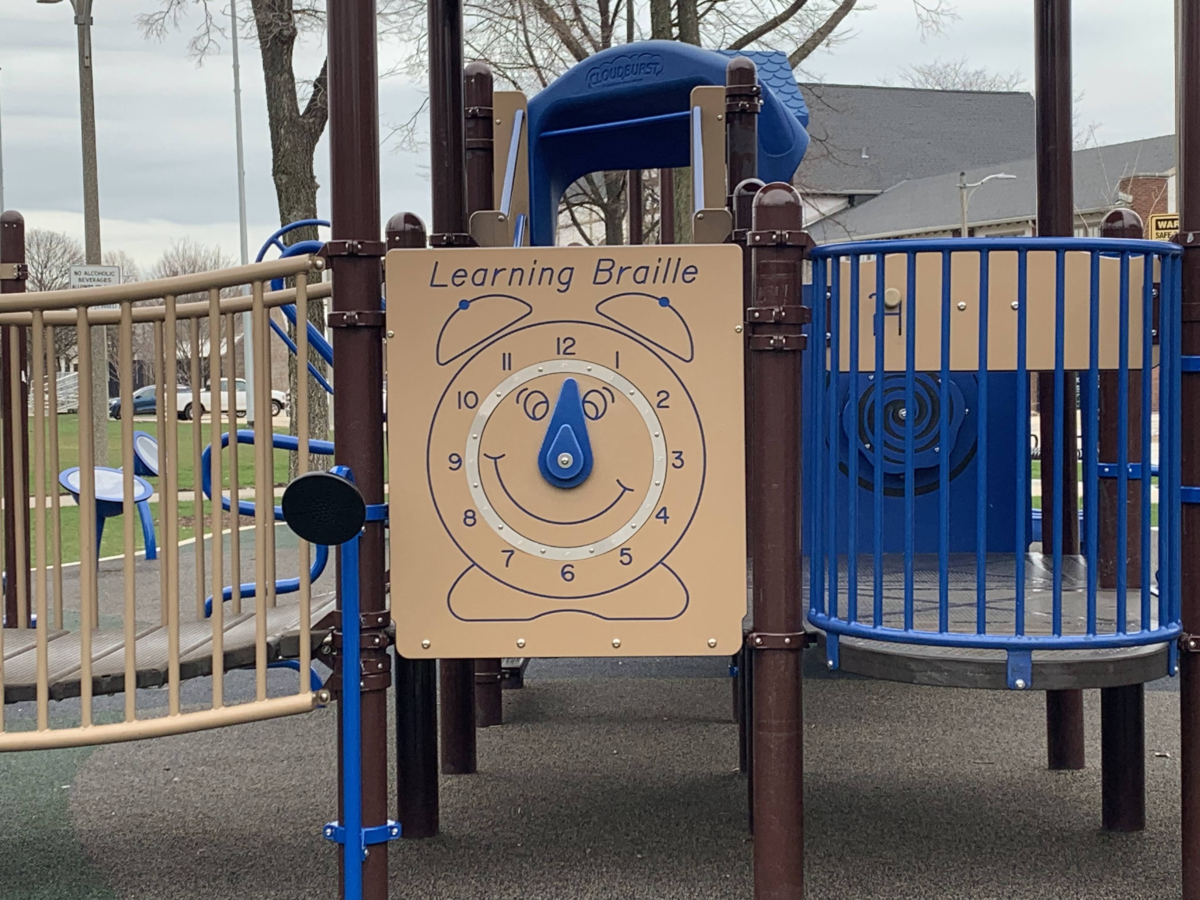 - An interactive panel with braille on one side and a clock on the other.