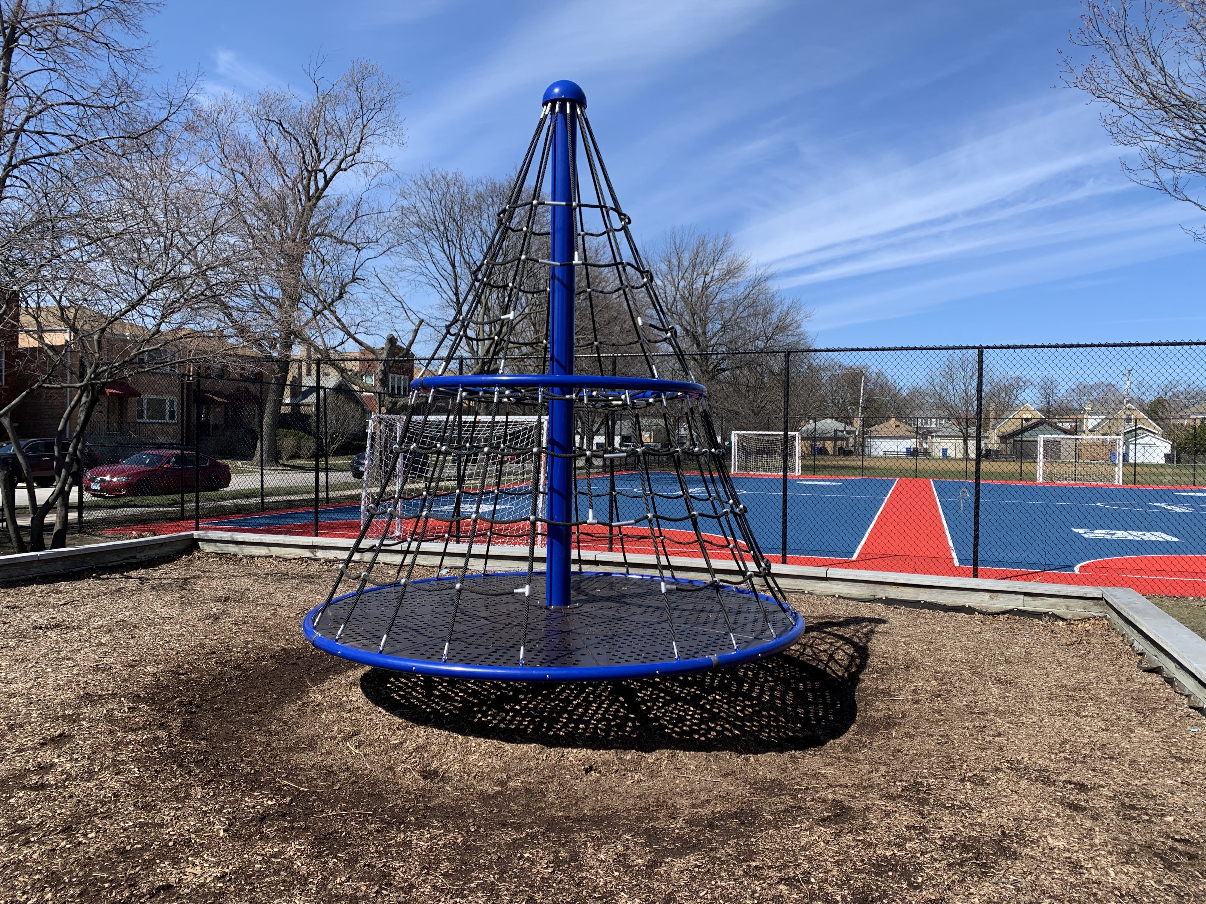 - An element consisting of a large circular, horizontal platform that can rotate around a central point and a large conical climbing net.