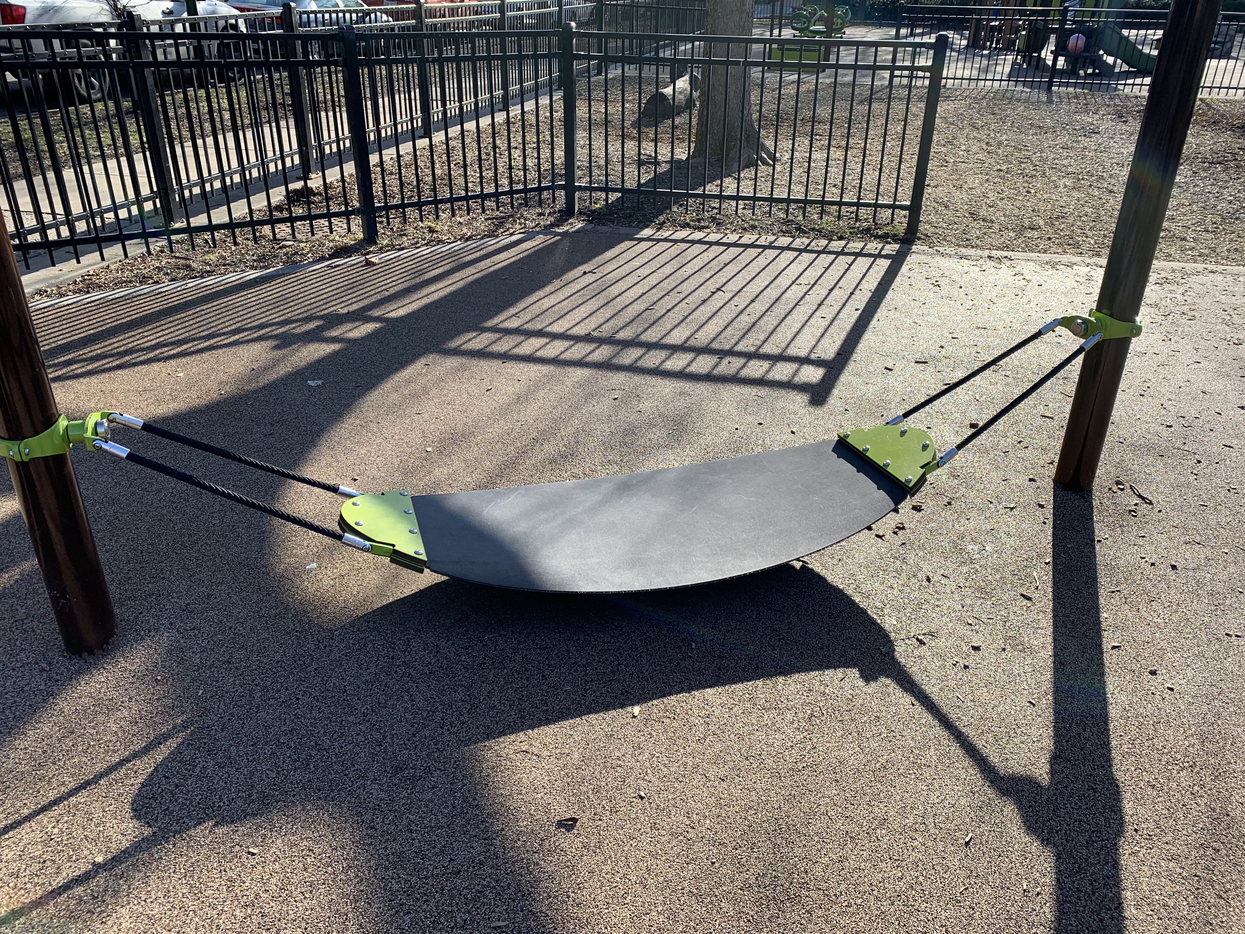 - A swinging element fixed between two vertical beams, typically low to the ground, made of a rubber belt that swings freely.