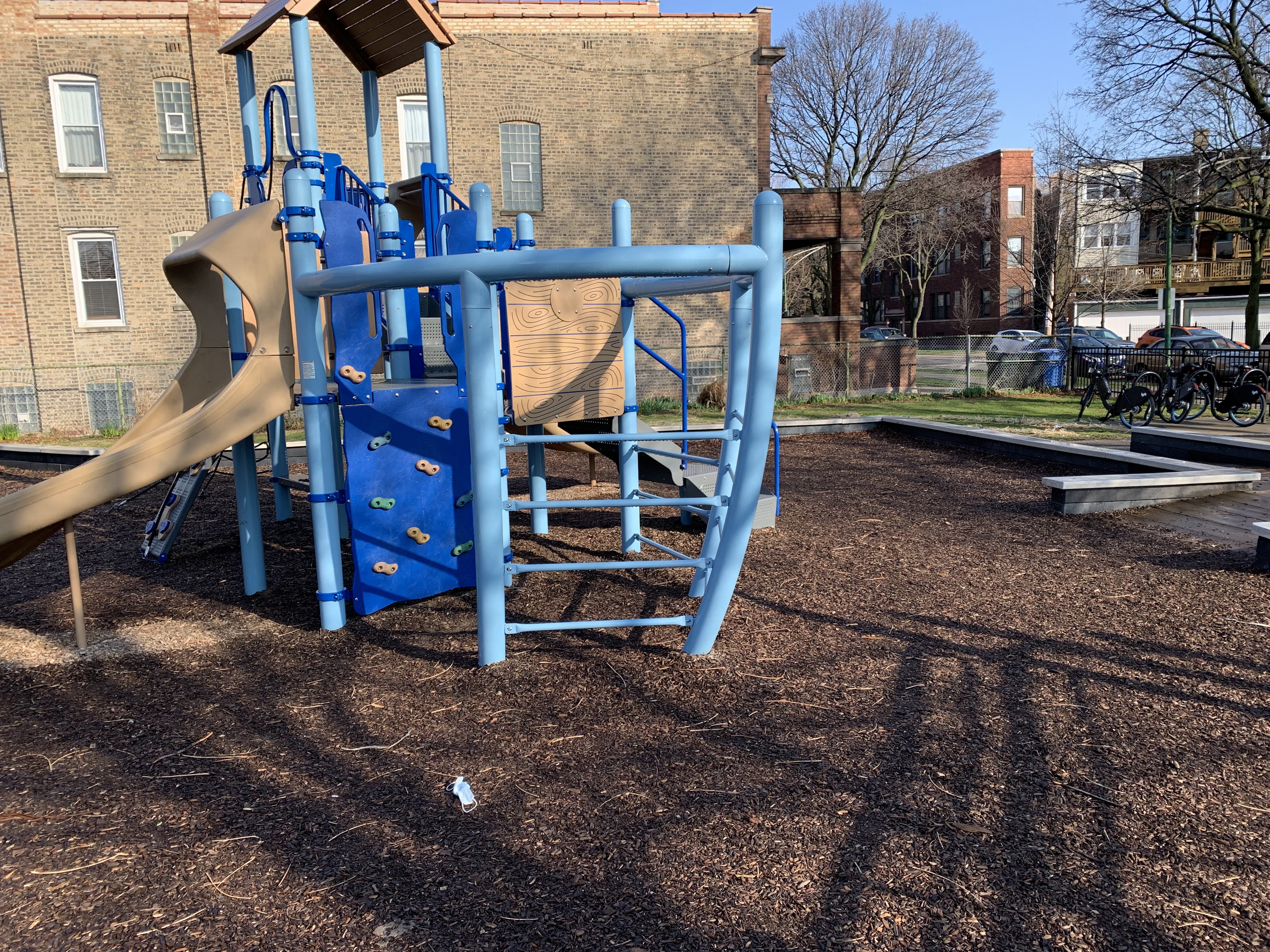 - A climbing element created by several vertical support poles with horizontal metal beams connecting them like the rungs of a ladder; the entire element is curved in the shape of a ship's bow.