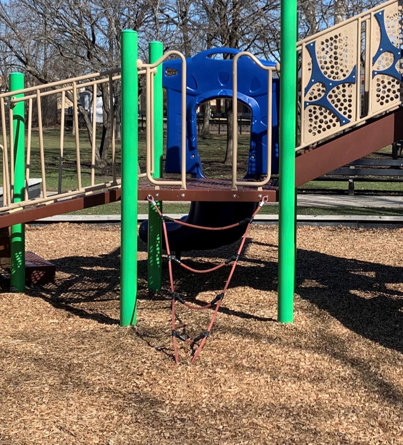 - Climbing element shaped like an isosceles triangle where the legs form the vertical supports with several rope rungs horizontal to the ground.