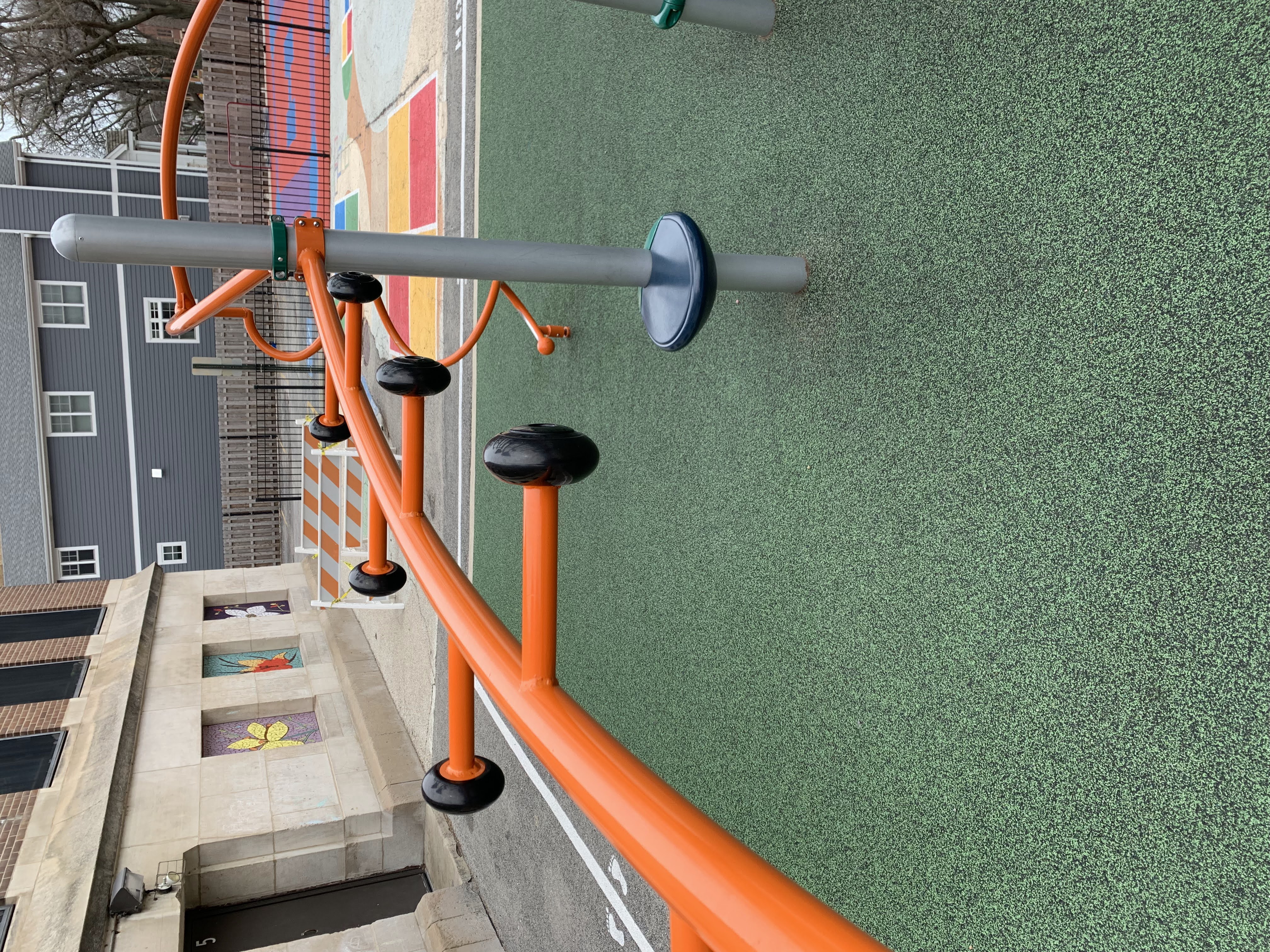 - An overhead element consisting of a single beam with alternating hand holds; each hand hold has a end cap.