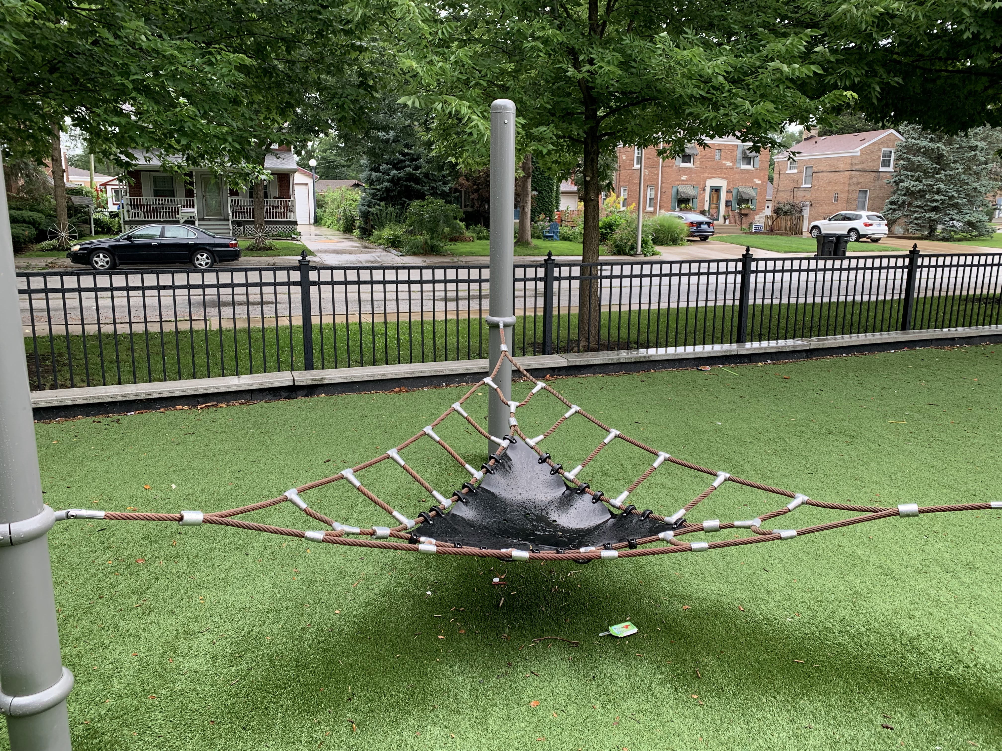Supported by three vertical columns, this element consists of a triangular net and a black belt 'nest' in the middle.