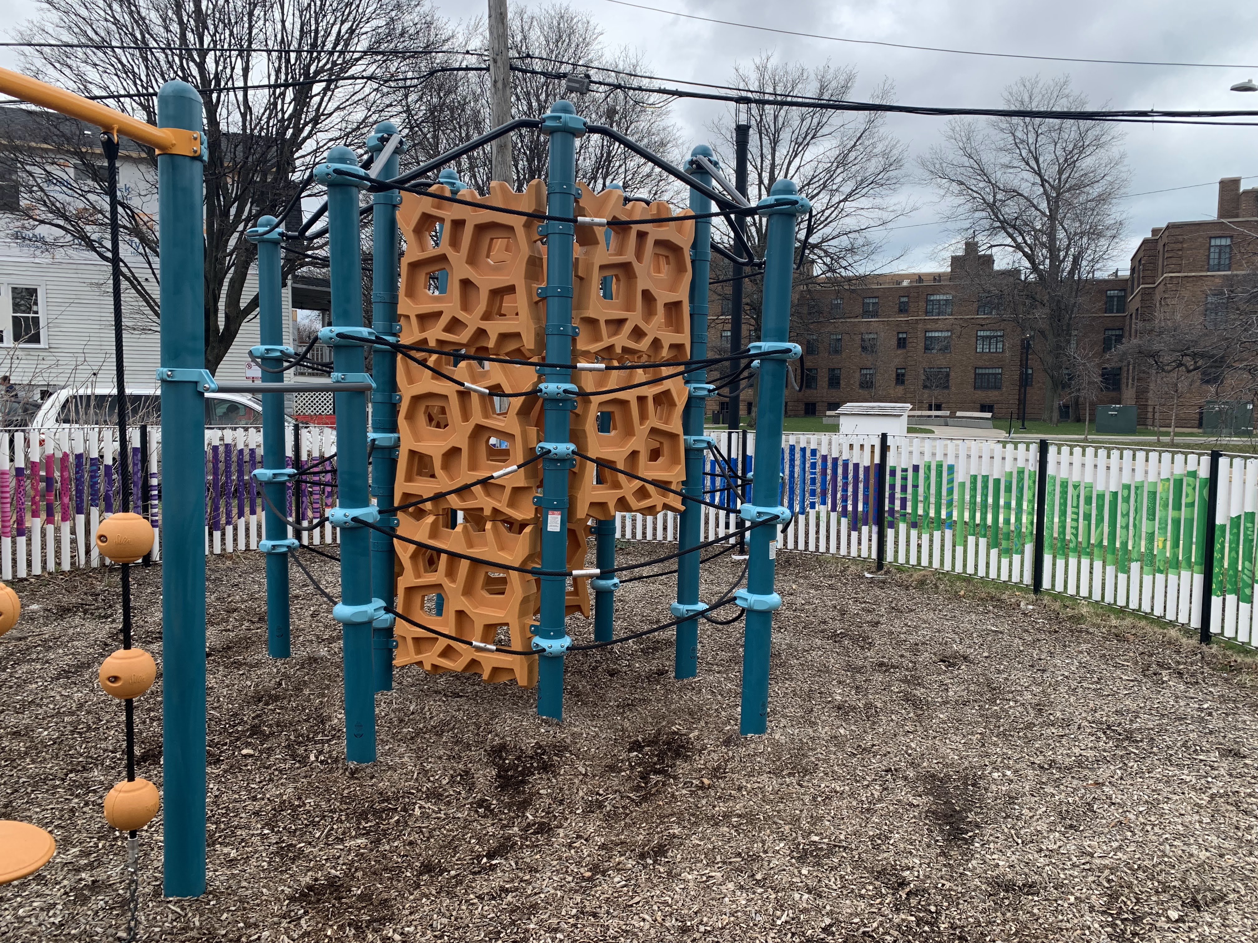 - A climbing element with an irregular geometric pattern with voids to facilitate climbing.