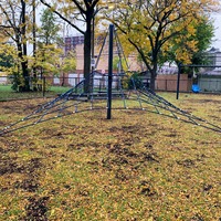 - A climbing structure with a single, vertical support pole and four ground anchors creating four triangular faces with rope netting.