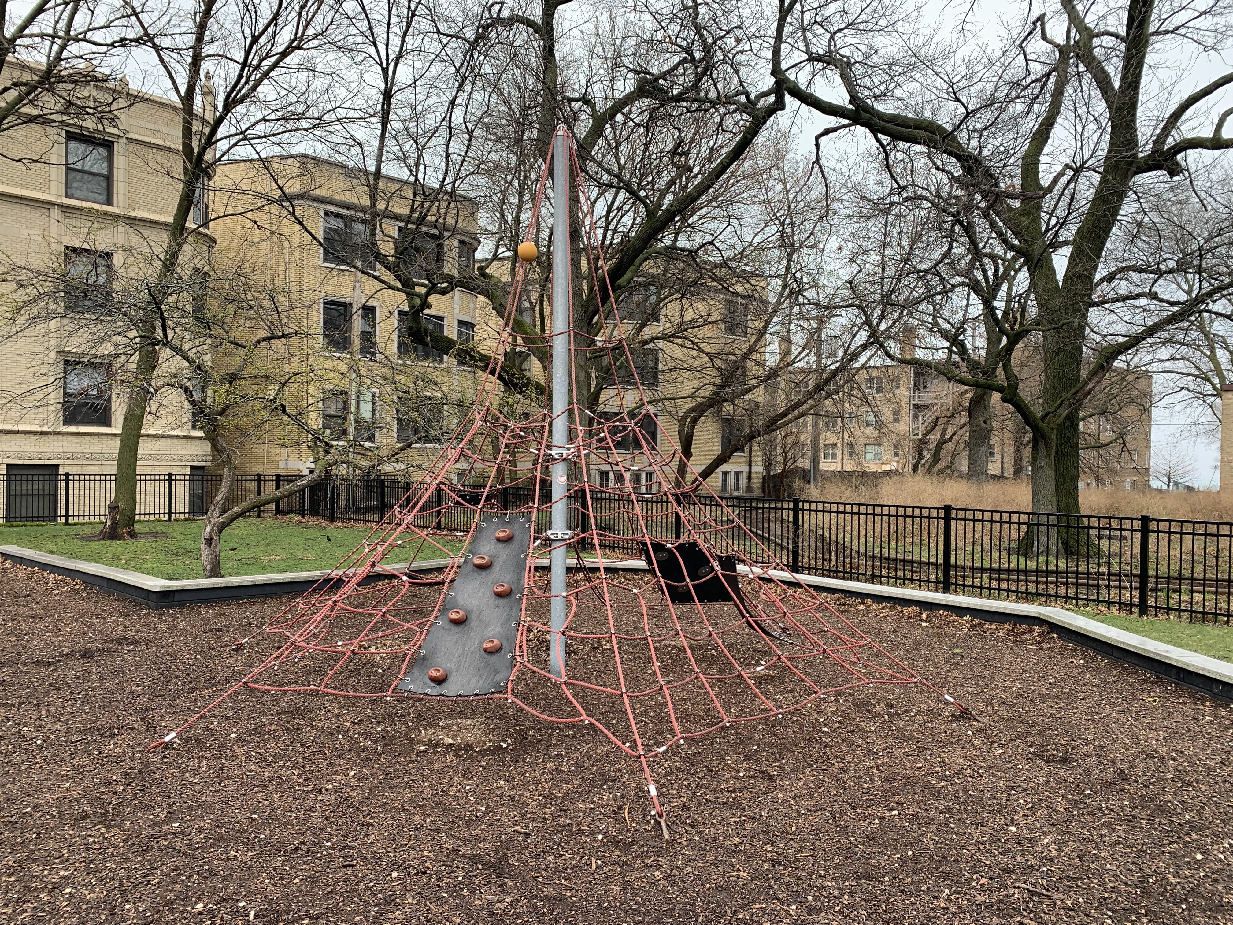 - The 'single mast' is the central pole - the rope netting creates a pyramid shape with six triangular faces. Some of those faces have black belt patches with climbing wall holds.
