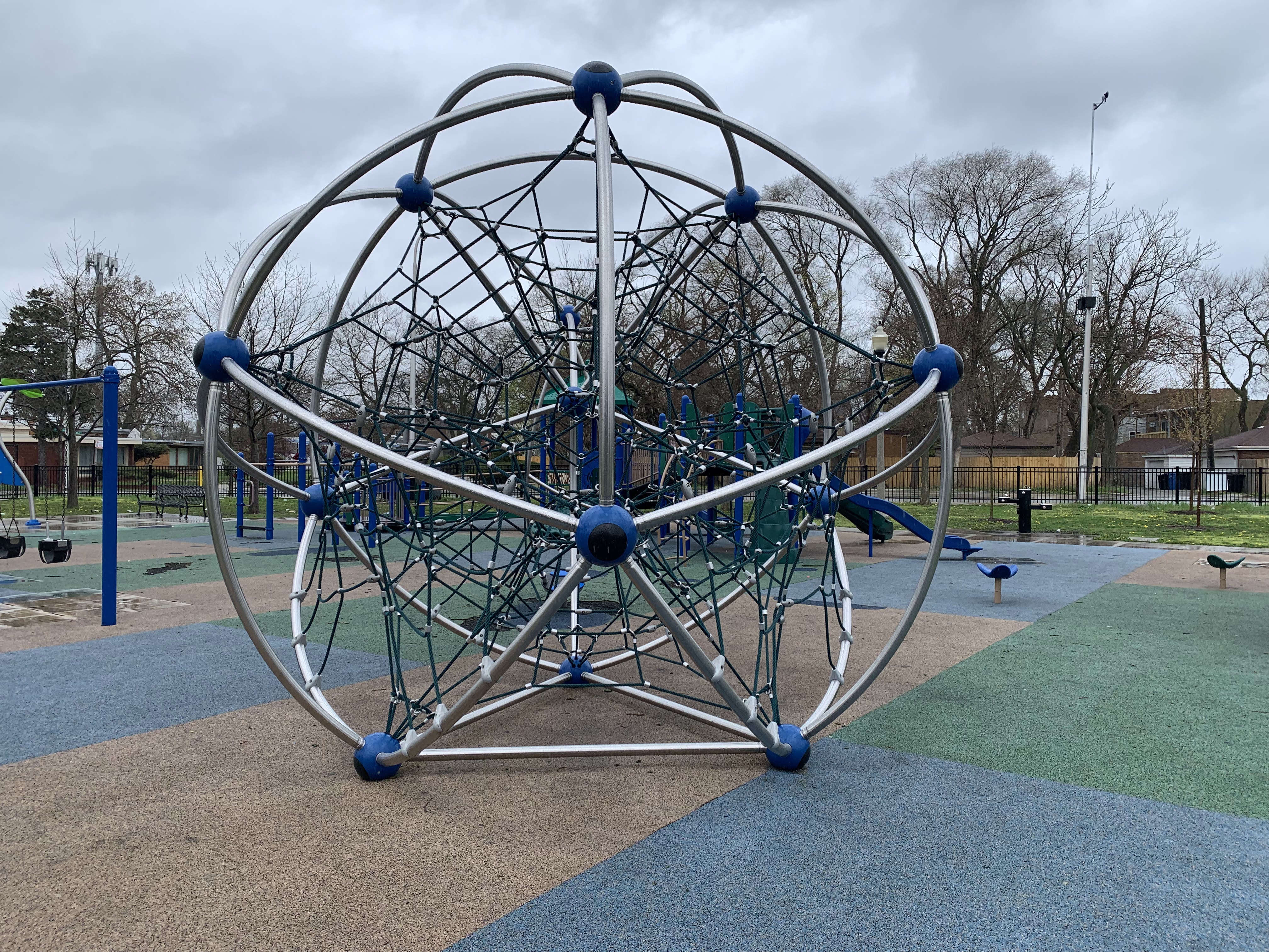 - A large net climbing element inside a largely spherical metal support (where the metal support structure is created by curving triangles).