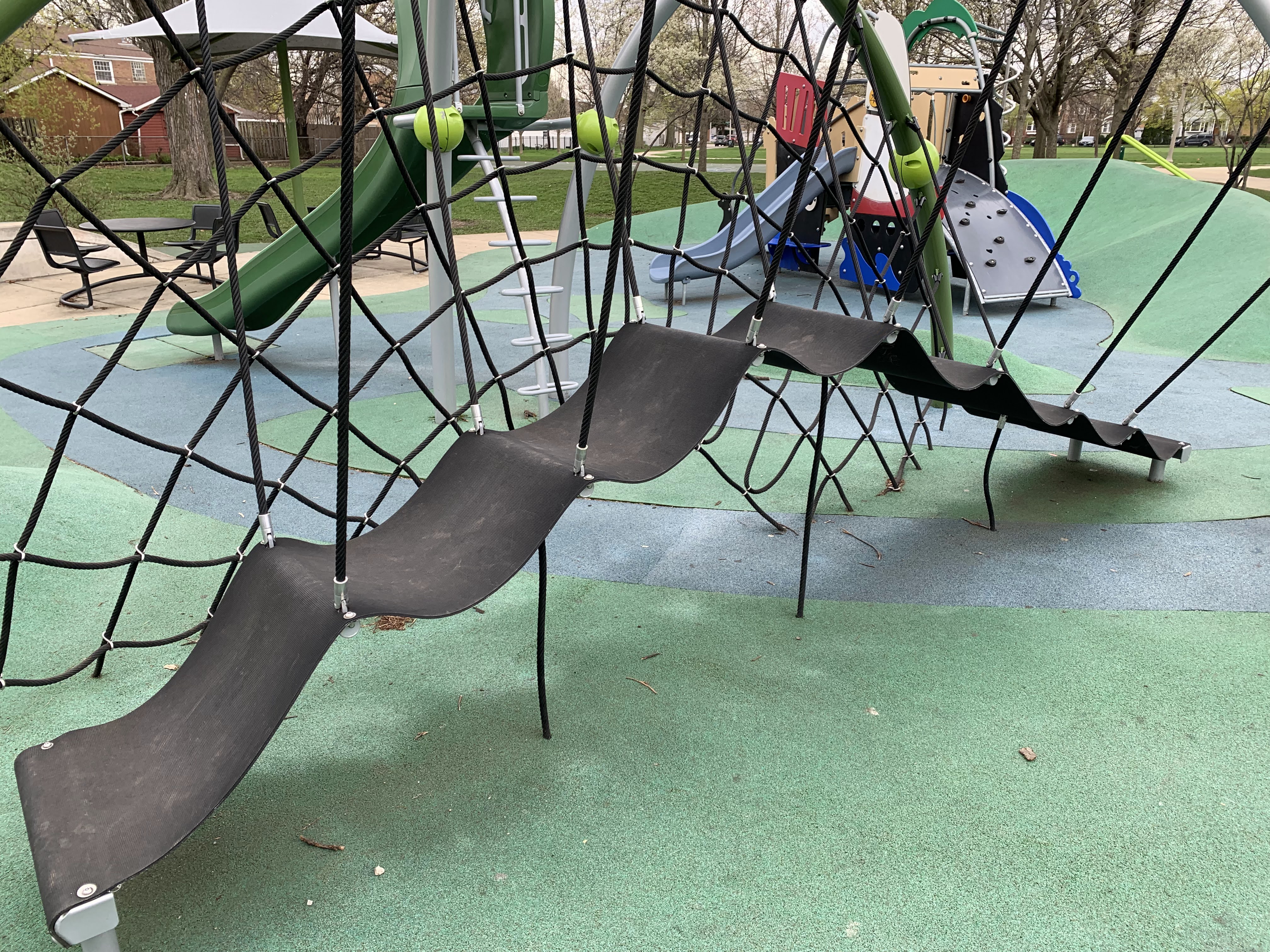 - A playground element with a rectangular length of black belt material is suspended from ropes above and anchored to the ground by ropes to create a wavy climbing surface.