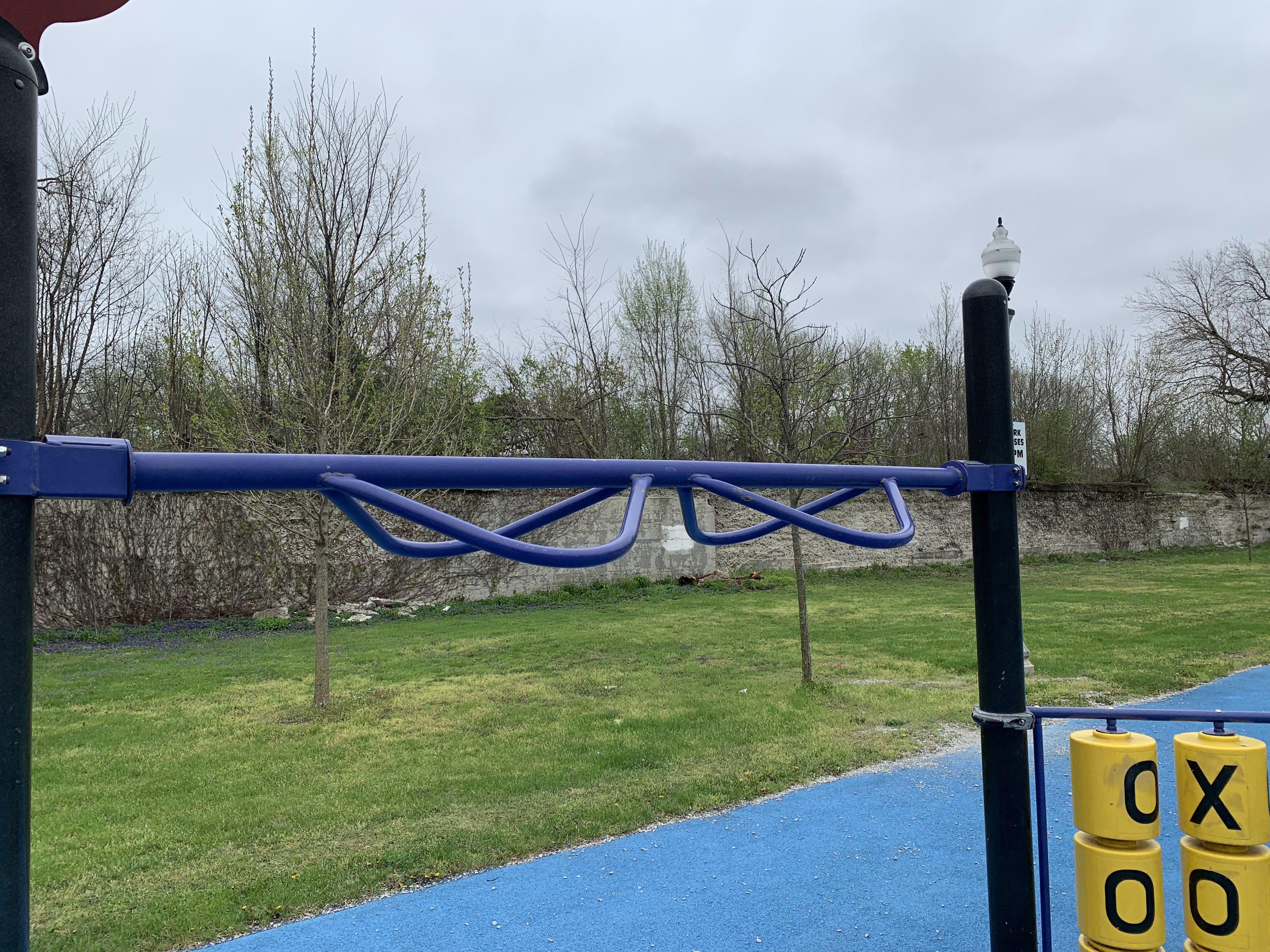 An overhead element created by single support beam and two sets of circular hand holds angled slightly toward the ground.