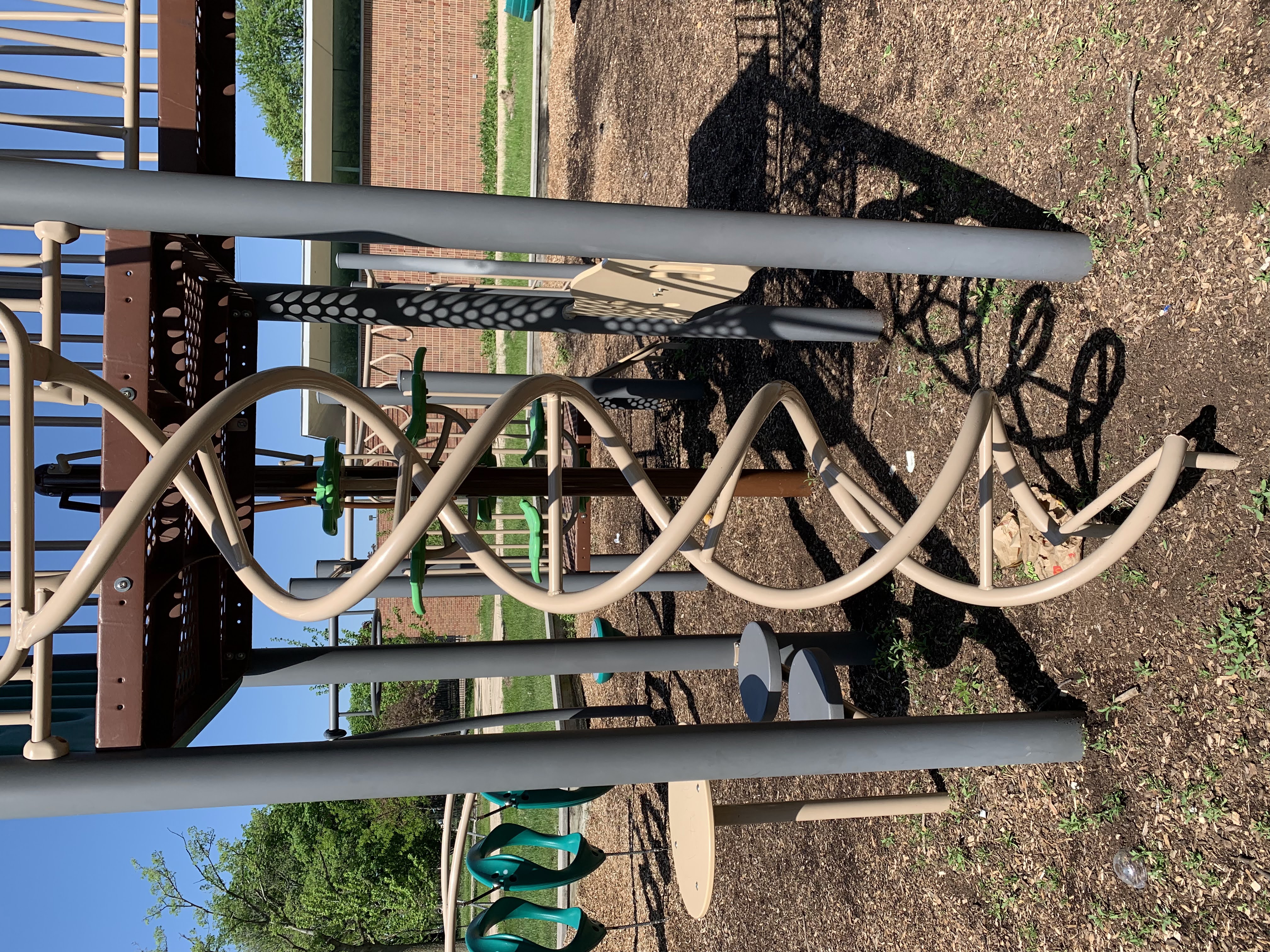 - A climbing element created by two vertical poles that spiral upwards and straight metal rungs connecting them.