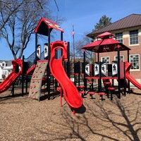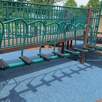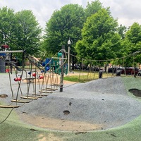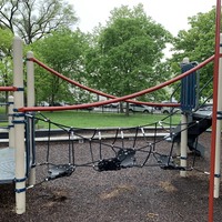 - A bridge element connecting two platforms created by a rope net bridge with small, separate planks along the bottom.