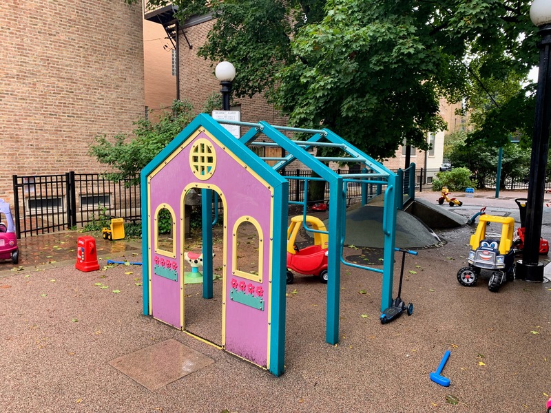 A collection of elements (mainly a monkey bar roof) shaped like a little pink house.