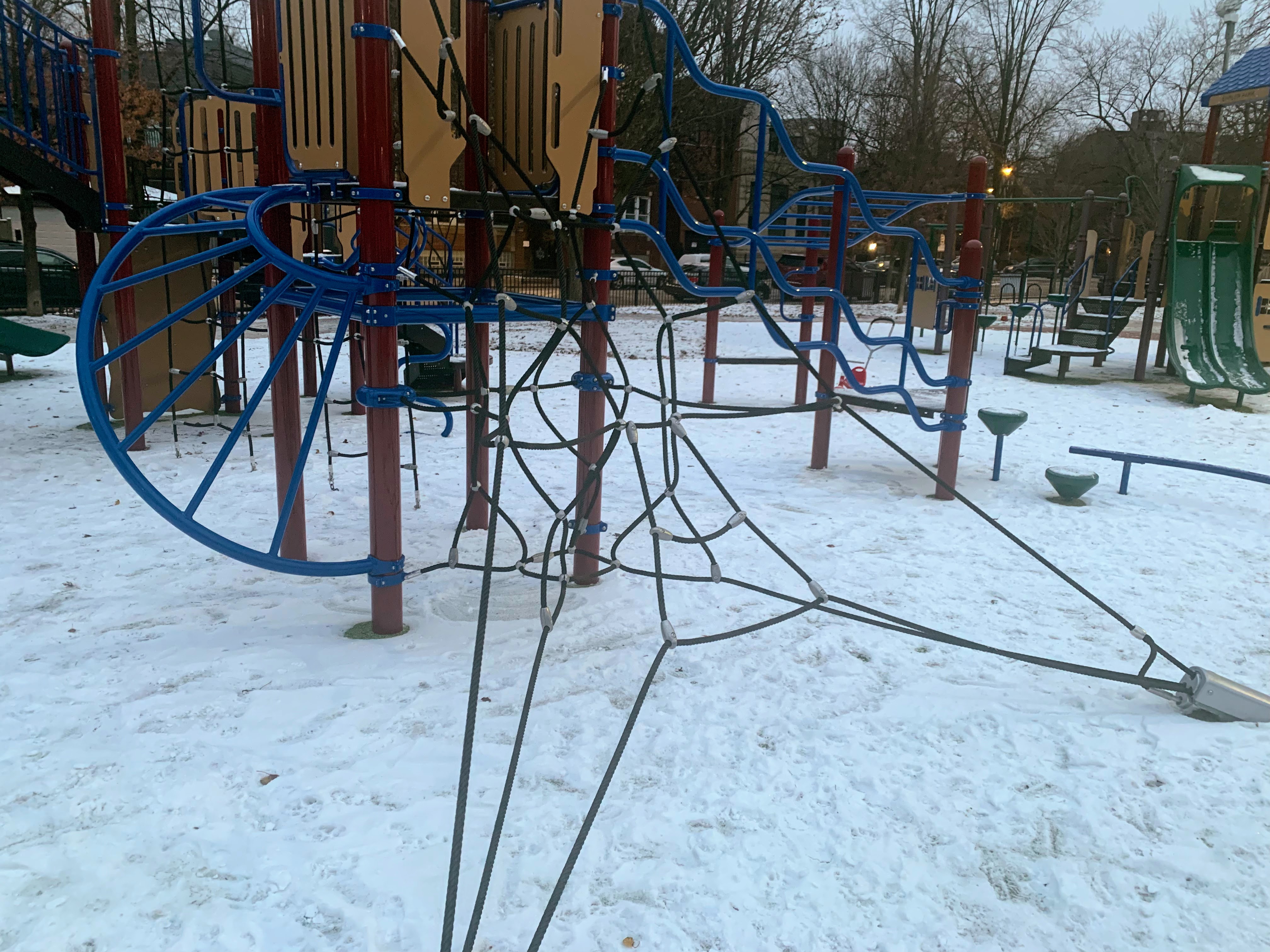 - A rope net climbing element with two anchors in the ground and a tangle of ropes connected to a raised platform.