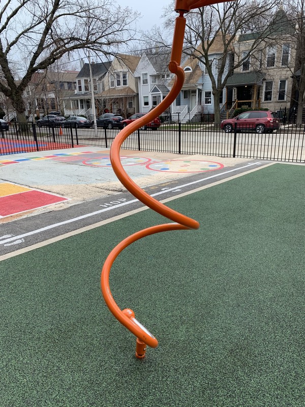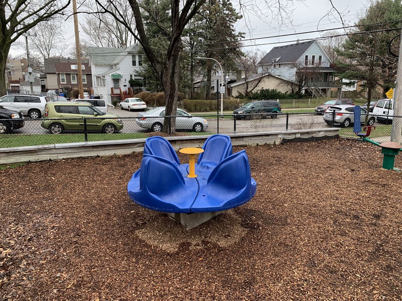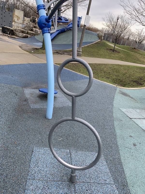 A spinning element where a circle mounted to a short pole not parallel with the surface can spin freely located directly below a circle shaped like a steering wheel mounted to structure above the lower circle.