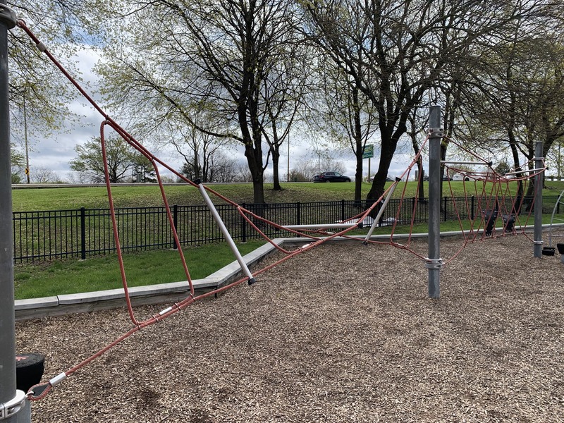 A huge, standalone element created by vertical metal poles with ropes and metal 'rungs' creating a suspension bridge meant to be climbed and traversed.