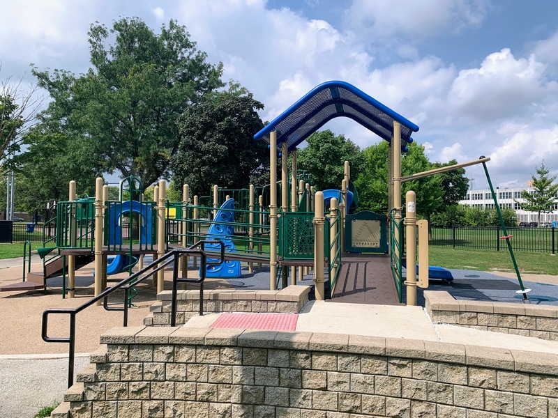 A flat panel held parallel to the ground by a central pole. The panel is oval shaped with a spiral groove cut into the top with a clear plastic bubble shaped lid. Users can tilt the panel slightly moving the marble inside along the spiral path.