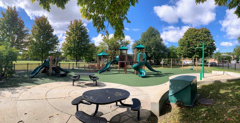 Brainerd Park - PlaygroundBrainerd Park features a solid neighborhood playground and water spray feature on the west side of the park. The playground contains two structure. The smaller structure is designed for younger children and the larger structure is designed for older children and is quite large and sprawling. It contains a variety of slides and climbing elements and is partially accessible via a ramp. There is also the standard Chicago Park swing options: toddler, adaptive, and belt seat. The water spray feature is a triple shower sprayer. The non-play elements are also solid. The play area is fully enclosed and the soft rubber play surface is shaded by large trees. There are benches in the play area and the park building to the south should provide access to bathrooms and a drinking fountain (when open). All in all, this is everything a neighborhood playground should be; highly recommend.