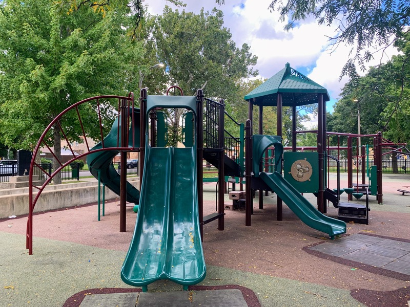 Algonquin Park - Playground ParkAlgonquin Park is a small neighborhood pocket park in the middle of a quiet street with a great playground. There are two play structures (one for younger kids and the other for older) that features the standard slides and climbing elements. There are a few standalone elements like a see-saw and 'things on a spring' as well as a set of swings near the back of the site. The play area is fully enclosed and the play surface is soft rubber. There are benches, a picnic table, and a drinking fountain in this bright and sunny park. In my mind, this is a perfect neighborhood playground; highly recommend.