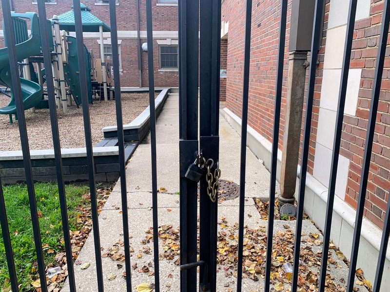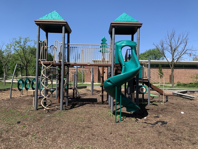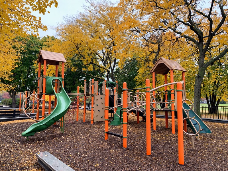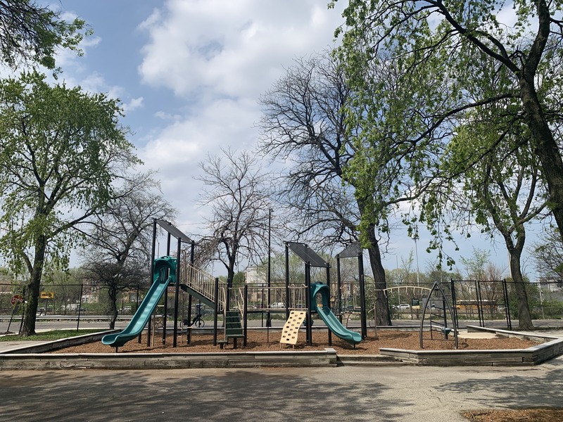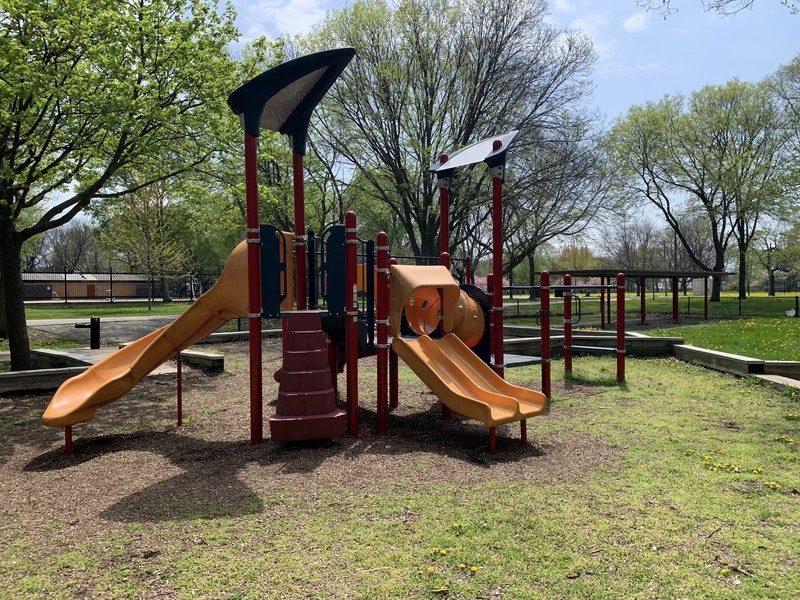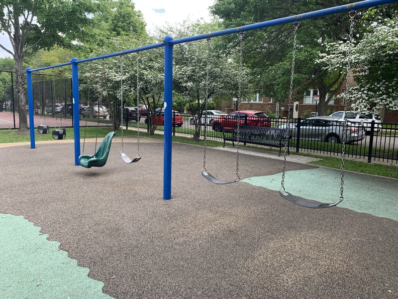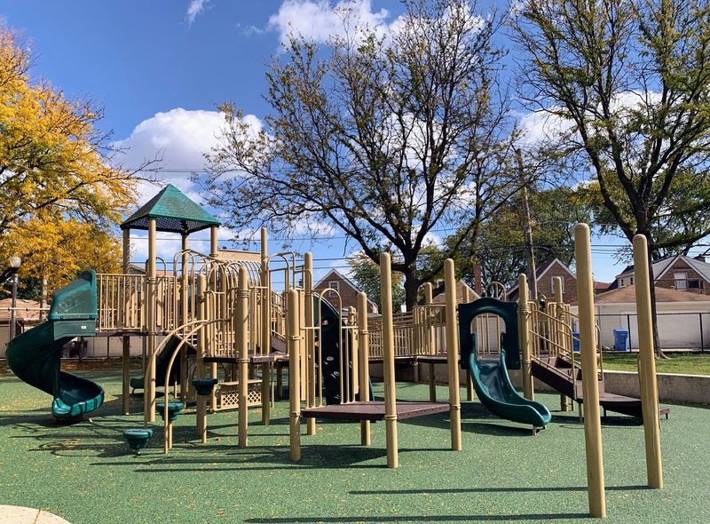 Altgeld Park - PlaygroundRenovated in 2013, this small playground is located in the northwest corner of Altgeld Park and features a large play structure designed for older children. This structure includes a few slides, climbing elements, rope bridge, and monkey bars. In a separate area, the playground also contains a small playhouse, a see-saw, and the standard set of swings. The play area is fully enclosed and the play surface is wood chips. The site has some large trees that provide some shade and a small, covered pavilion for additional shade.