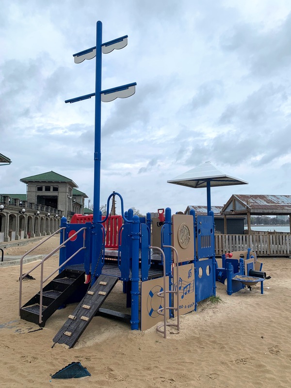 63rd Street Beach PlaygroundThis playground, situated on the 63rd Street Beach, reflects it's location with a strong nautical theme. The entire play structure is shaped like a ship and is equipped with a steering wheel, tall mast, and even canons! This playground is fully integrated with the beach and is therefore not enclosed, in full sun, and the play surface is - of course - sand. This creates a unique play experience and offers some great views of Lake Michigan.