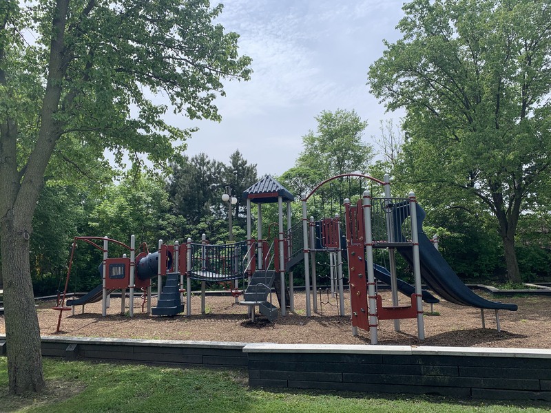 Anderson (Louis) Park - PlaygroundAnderson Park is a small park with a great little playground. The playground is somewhat standard but is also wonderful. There is a single large play structure with a few slides, climbing elements, and plank bridge (thought, strangely, no monkey bars). There is a standard set of swings (toddler, adaptive, and belt seat) and 'four sprayer' water feature. The setting is wonderful - sharing a site with two public schools and a fieldhouse - and it gets wonderful shade from the large, mature trees towering overhead. There are benches and a drinking fountain and access to bathrooms (when the fieldhouse is open). All in all, this is a great little playground. Highly recommend.