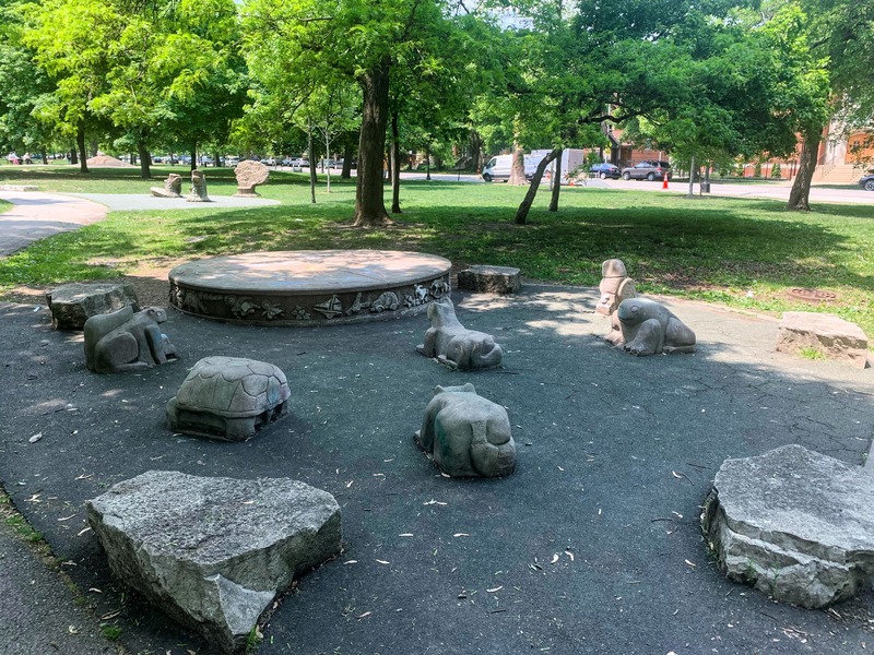 This small playground is full of art and is based on the book "The Velveteen Rabbit" making it a great spot for a quiet adventure and then a snack and a book on a blanket. This playground opens directly into the quiet and shady Palmer Square Park but is not fully enclosed or fenced from the street.