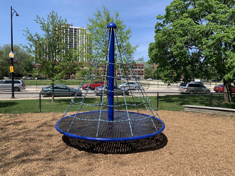 Dunbar Park - North PlaygroundThis playground - one of two in Dunbar Park - is a great playground for a climber. Most of the equipment in this playground uses cables and nets for the main climbing structures and is therefore somewhat unique among Chicago playgrounds. Although there are limited options for young children, older climbers will likely enjoy the challenge of the two large climbing structures, rope bridge, and single curved slide.