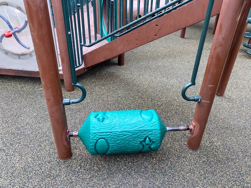 Log RollerThis element is a plastic 'log' mounted on a metal pole set horizontal and low to the ground so that the 'log' can spin freely. There are handholds nearby so feet can spin the 'log.'