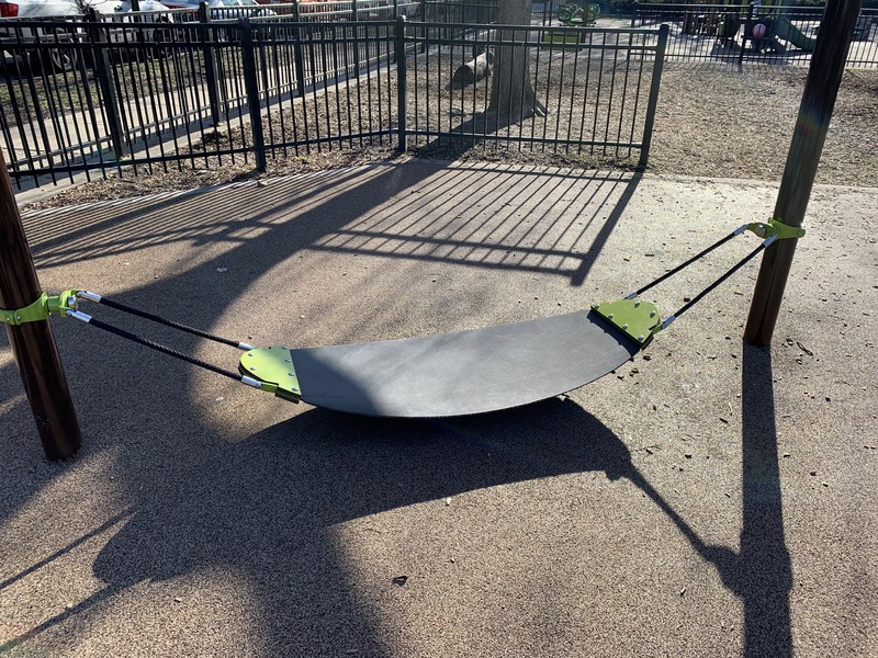 Hammock SwingA swinging element fixed between two vertical beams, typically low to the ground, made of a rubber belt that swings freely.