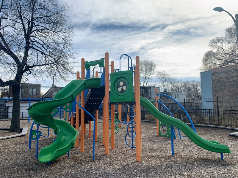 Humboldt Park - West PlaygroundThis playground - one of 5 in Humboldt Park - is located on the west side of the park near Division and Kedzie. This playground is a great play area surrounded by trees and features a swing set, a small play structure for younger children, and a large, sprawling play structure for older children with a variety of slides, climbing elements, and monkey bars. The amenities are also quite nice. The play area is fenced from the street (though not fully enclosed) and nicely surrounded by mature trees. Inside the play area are a few benches and even a picnic table for seating. The play surface is soft rubber and the larger play structure is somewhat accessible by a ramp. All in all, this is a solid playground with amenities to make it a comfortable place for the whole family; highly recommend.