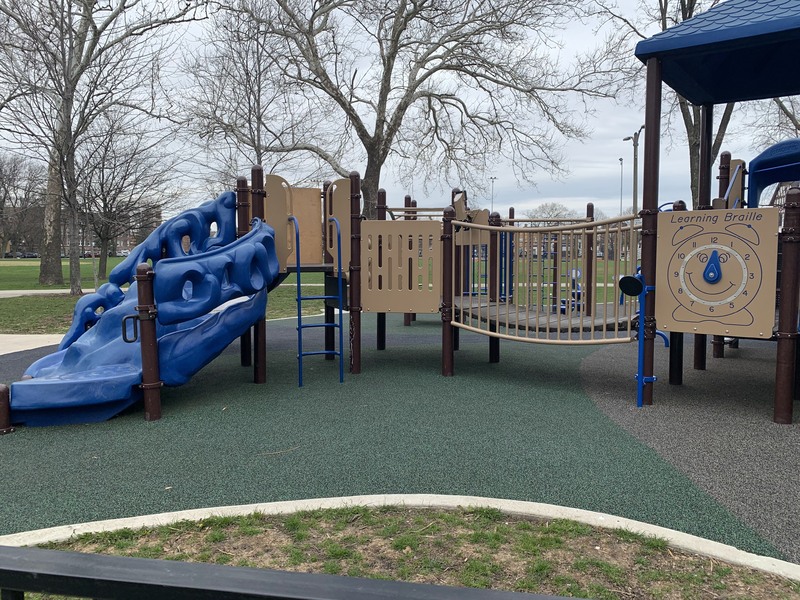 Haas Park - PlaygroundHaas Park is a wonderful park with a new fieldhouse, large soccer field, playground, and water spray feature. The playground has two large structures. One structure is designed for younger children and the larger structure is designed for older children and is accessible via a ramp. There is a wide variety of slides, climbing elements, and monkey bars as well as swing sets with the standard Chicago Park swings (toddler, adaptive, and belt seat). The water spray feature is in the same area as the playground and is a 'triple shower sprayer.' The play area is fully enclosed and is next to a new fieldhouse building that provides access to bathrooms (when open). There are also benches and a drinking fountain in the fully enclosed play area. The main play surface is soft rubber and large trees provide some shade throughout the day. All in all, this is a great playground; highly recommend.