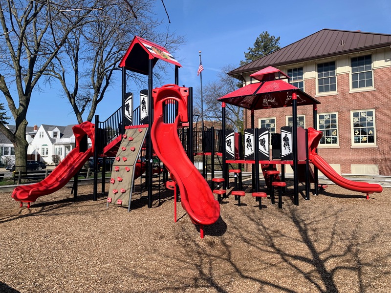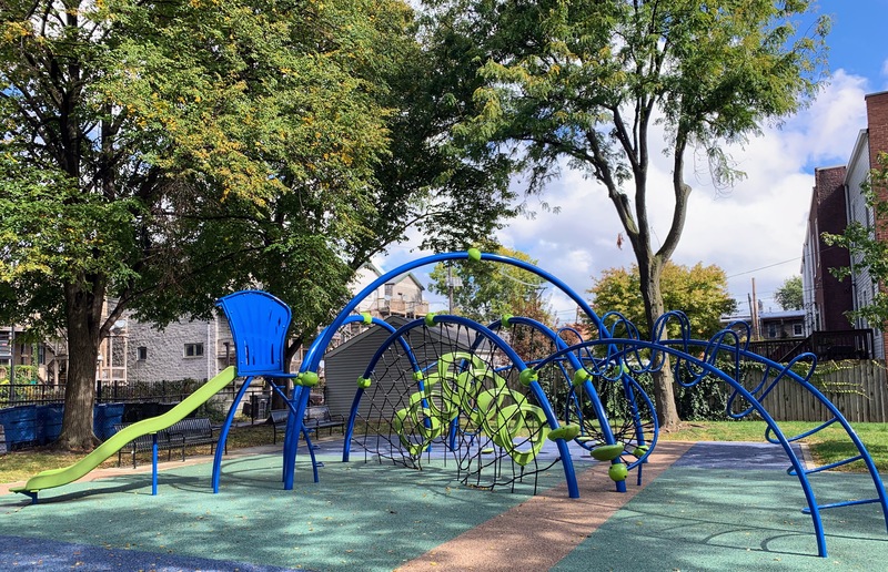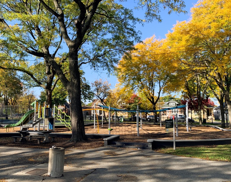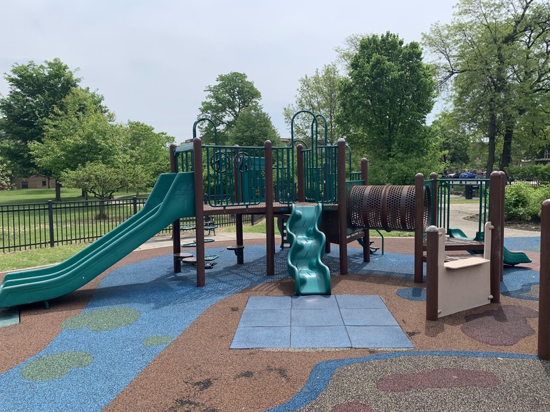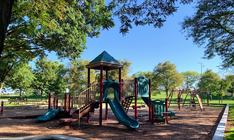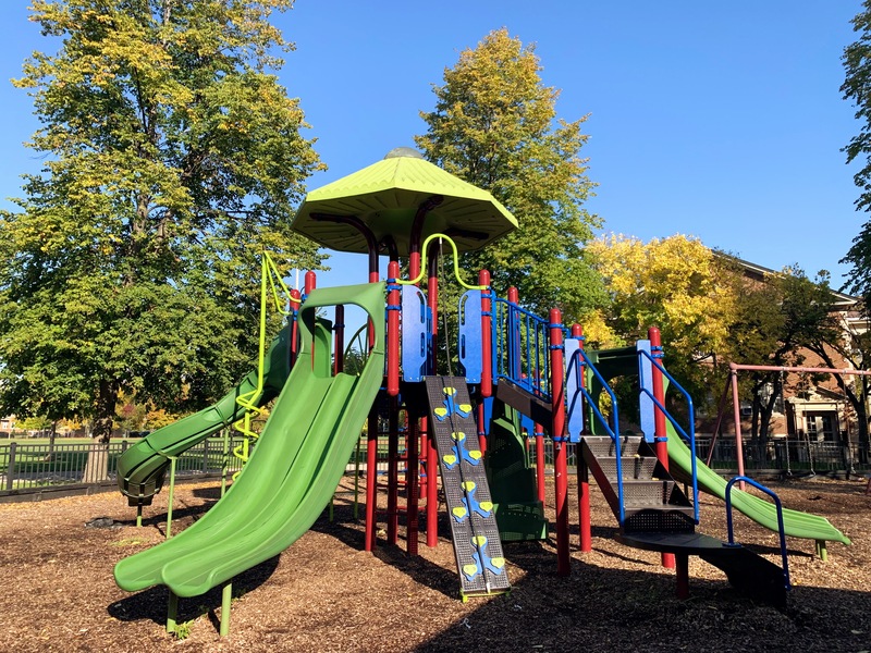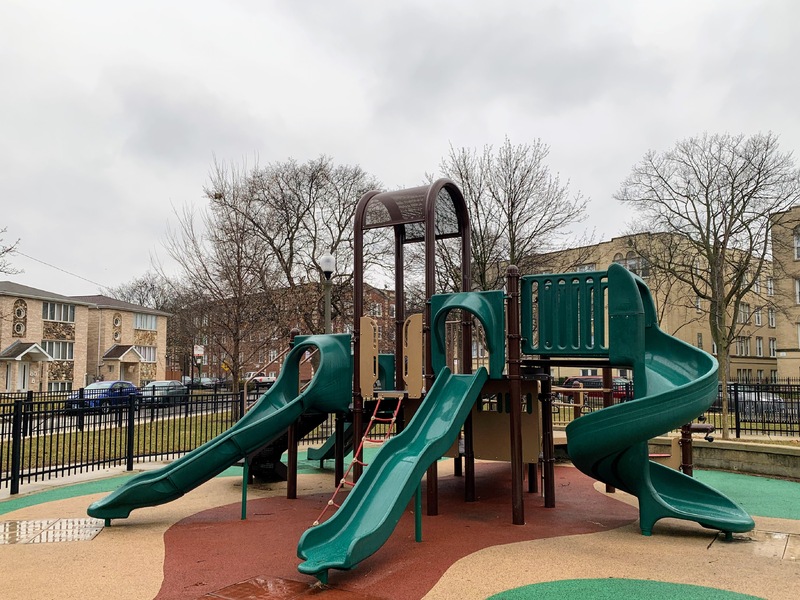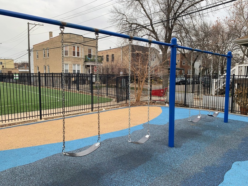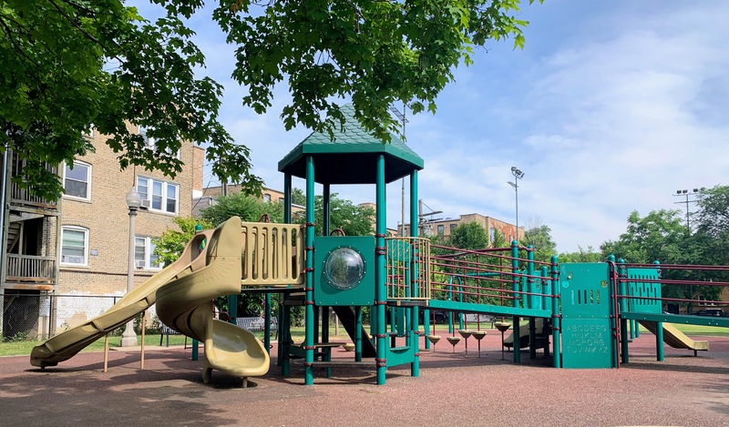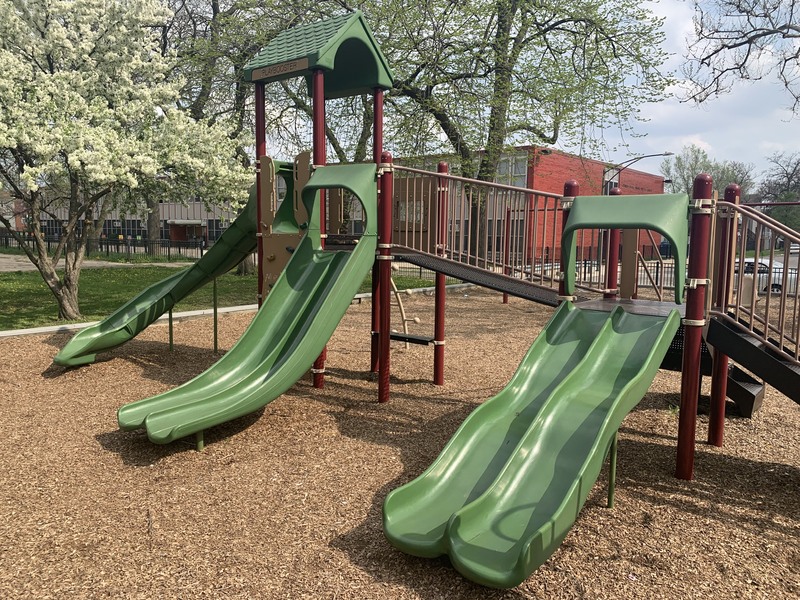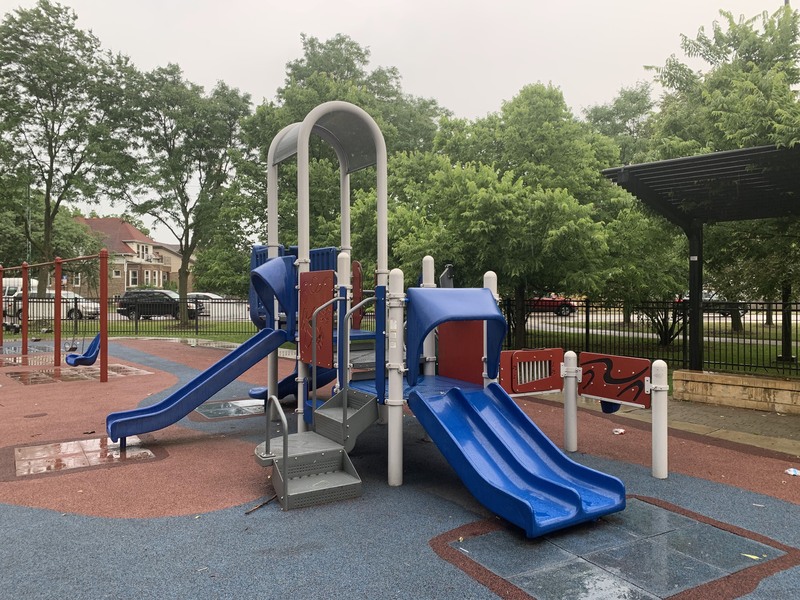 Erhler Park - PlaygroundRenovated in 2022, the playground at Erhler Park is a gem. There are two large play structures with modern equipment as well as a small area with interactive panels for very young park goers. The two large play structures have a variety of slides - including a tube slide and a 'big slide!' - climbing elements, and monkey bars while maintaining a traditional playground look/feel. There are also two sets of swings with the standard Chicago Park offerings: toddler, adaptive with a harness, and belt seat. The setting is beautiful: there is a large row of trees on the southern edge of the park and the fully enclosed park opens onto grassy areas on both sides. There are benches and a drinking fountain and the play surface is newly restored soft rubber. It's a great playground; highly recommend.