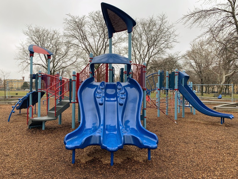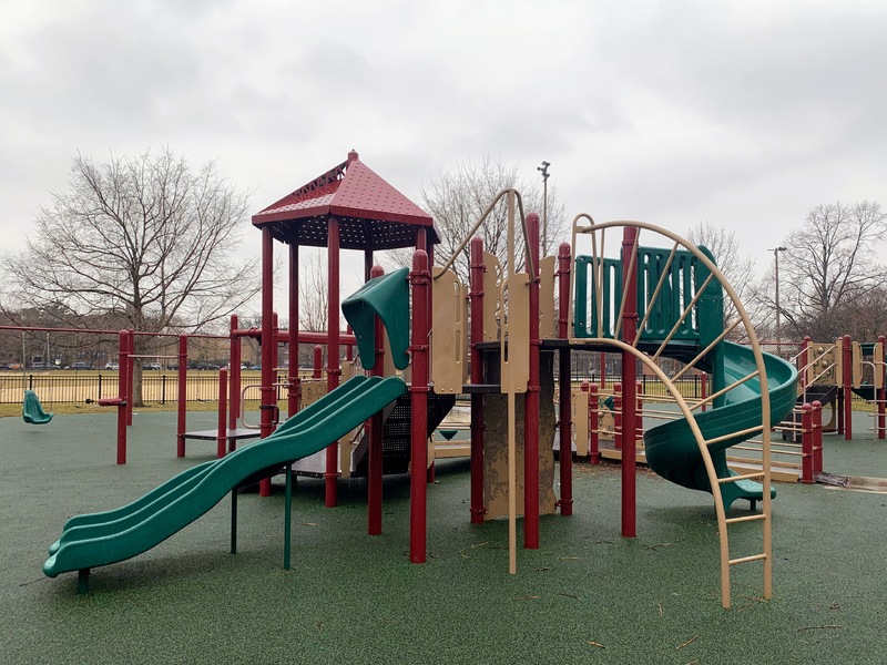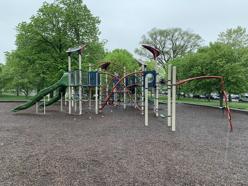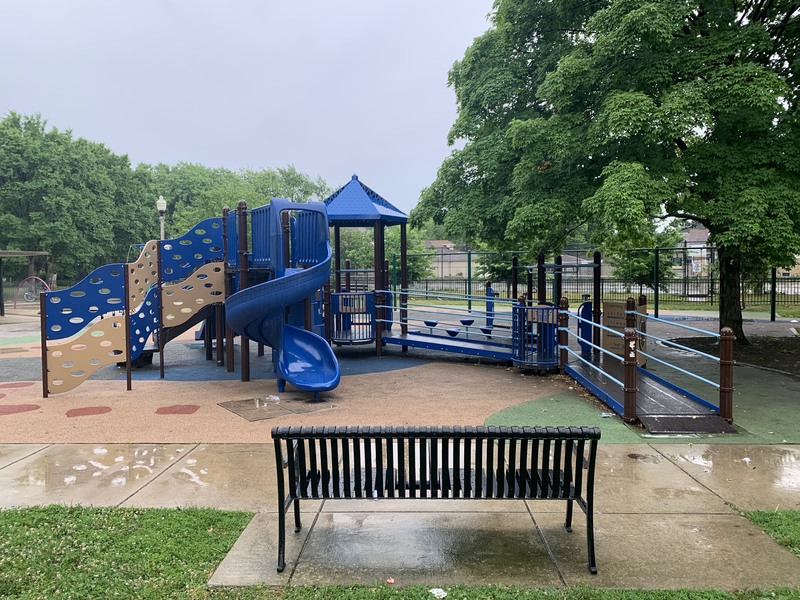 Jefferson (Thomas) Memorial Park - PlaygroundJefferson Park is a large park with a variety of athletic fields, a pool, and a nice playground with a water spray feature. The playground features a large structure (accessible via a ramp) for older children and a smaller structure for younger children. There is the standard Chicago Park set of swings (toddler, adaptive, and belt seat) and a single pole water sprayer. The non-play amenities are nice; there are plenty of benches and a drinking fountain around the soft surface play area. The nearby fieldhouse provides access to bathrooms (when open) and there is a pool at this park as well. All in all, this is a great neighborhood playground; highly recommend.
