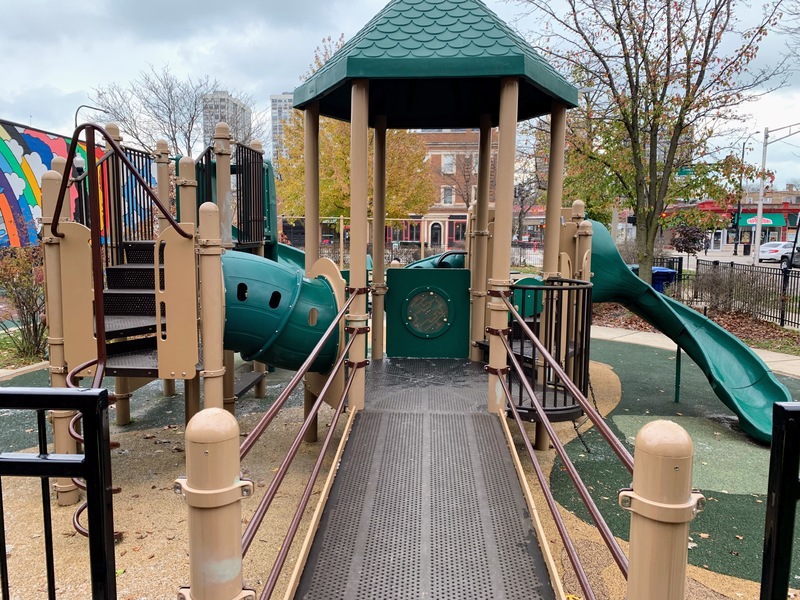 Bromann Park - Playground ParkBromann Park is a busy park on a busy corner of Chicago that fits a lot of equipment and amenities into a very small site. There is a standard set of swings, a collection of climbing/traversing elements, and a moderate size play structure accessible via a ramp. The amenities are solid: there are benches and picnic tables in the fully enclosed play area as well as a drinking fountain. The play surface is soft rubber and there is a lovely mural on the wall forming the north side of the park. All in all, this is a great little park - highly recommend.