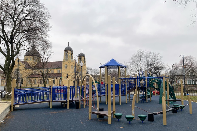 Cedar Park - Playground ParkThis playground in small Cedar Park packs a big punch: a large play structure for older kids, a separate smaller structure for younger climbers, new water spray features, and a few benches and picnic tables. The large play structure is notable because it includes a few climbing elements that are relatively unique in Chicago Park playgrounds. Parts of the large play structure can also be accessed via a ramp from the soft rubber play surface making this playground somewhat accessible. The water features are in the same fully enclosed play area and are both relatively gentle spray elements. The playlot is shaded by large trees and there are several benches and a picnic table for seating. This is a great smaller playground because it offers great equipment, water features, seating, and shade; highly recommend.