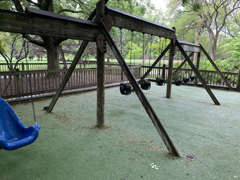 Chase Park - PlaygroundChase Park features a running track, outdoor pool, and a really great playground. The playground is located in the southwest corner of the park (Ashland and Leland) and features two main play structures as well as two sets of swings. The smaller play structure is designed for younger children and the larger is designed for older children; the larger structure is accessible via a ramp and sprawls outward with a few climbing and traversing elements. The non-play amenities are great. The entire play area is fully enclosed (important because Ashland is quite busy) and the surface is soft rubber. There are benches and picnic tables inside the play area with a drinking fountain just outside the gate and access to bathrooms via the fieldhouse to the north. There is also decent shade from the large trees surrounding the site. All in all, in terms of play equipment and amenities, this is a great playground; highly recommend.