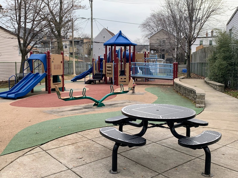 Bell Park - PlaygroundRenovated in 2015, the playground at Bell Park features modern equipment and a small water spray feature. There is a small structure for younger children and a larger structure for older children. There are also a few standalone elements including a zip line with a circle seat, a four person see-saw, and the standard Chicago Park swings (toddler, adaptive, and belt seat). The water spray feature includes a large overhead element and two small water sprayers. The non-play elements are great: benches, a picnic table, drinking fountains, access to bathrooms via the park district building (when open), and some shade. The play surface is wood chips and the playground is set back from the street (but not fully enclosed). All in all, this is a great playground; highly recommend.