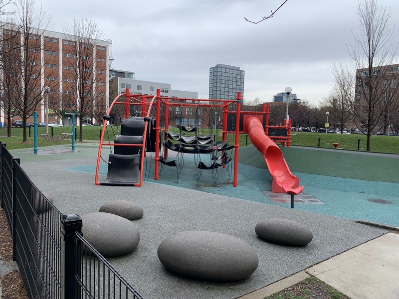 Parsons Park - Playground ParkParsons Park - named for Lucy Ella Gonzales Parsons who was a labor organizer and anarchist - features an interesting playground and water spray feature. The playground itself is somewhat sprawling; there is a set of swings near the entrance; a large, accessible play structure in the back corner of the site with a large triple slide; a single mast rope climbing elements; and a few more climbing elements and interactive panels on the eastern side of the park. The water spray features area include a 'loch ness mister' that may drain into a small stream. However, the water spray features were not on when I visited on a hot June day so I'm not sure about this... The site is fully enclosed and gets a fair amount of shade from a large umbrella, trees, and neighboring building. The surface is a combination of sort rubber and concrete with lots of rocks as well. There are a few benches and three small 'game tables' with checkerboard tops. If the water from the spray feature does indeed flow into the river bed, this would be an interesting and unique park worth a visit to see. Without this interesting water spray feature, however, this park is a relatively standard neighborhood park.
