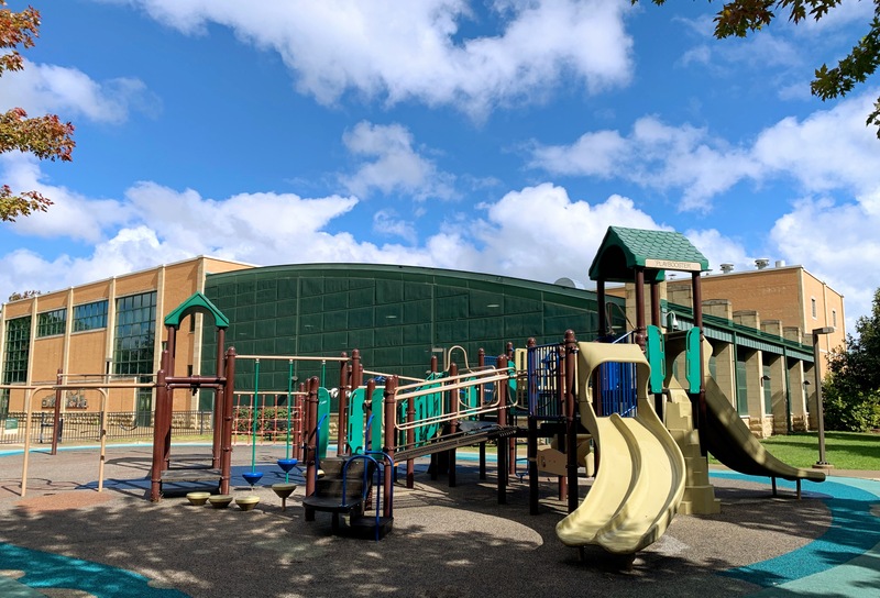 Gross Park - PlaygroundTo quote Shakespeare: "What’s in a name? That which we call a rose / By any other name would smell as sweet." I turn to the Bard to say that - despite this name Gross Park is not gross. In fact, it is quite nice. There is a single sprawling play structure that is accessible by ramp with elements for a range of children. There are also a few standalone elements - including a play dinosaur - and the same set of swings (toddler and belt seat only). The non-play amenities are great. Some large trees give shade throughout the day. Ample seating in the form of benches and picnic tables. A drinking fountain and a small fieldhouse which should provide access to a bathroom (when open). And a soft rubber play surface in a fully enclosed park. Lots of things make this a comfortable place to spend a morning; highly recommend.