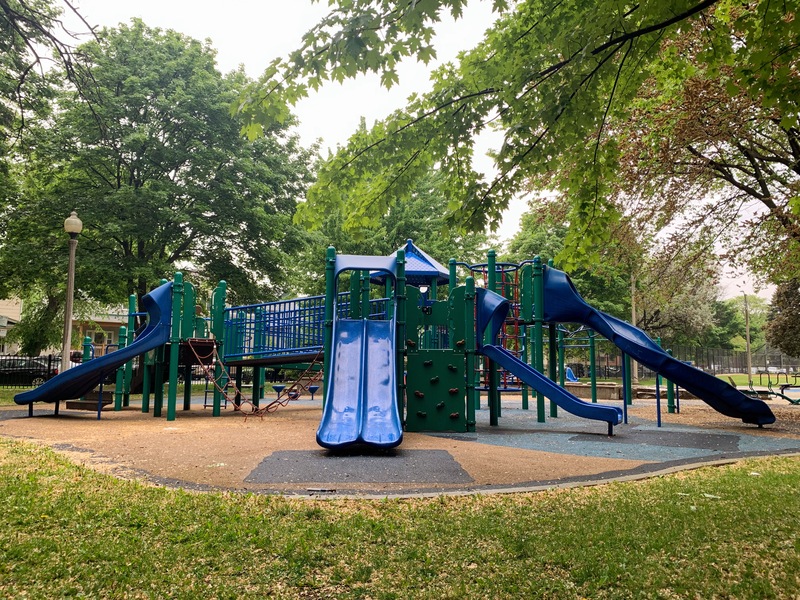 Algonquin Park - Playground ParkAlgonquin Park is a small neighborhood pocket park in the middle of a quiet street with a great playground. There are two play structures (one for younger kids and the other for older) that features the standard slides and climbing elements. There are a few standalone elements like a see-saw and 'things on a spring' as well as a set of swings near the back of the site. The play area is fully enclosed and the play surface is soft rubber. There are benches, a picnic table, and a drinking fountain in this bright and sunny park. In my mind, this is a perfect neighborhood playground; highly recommend.