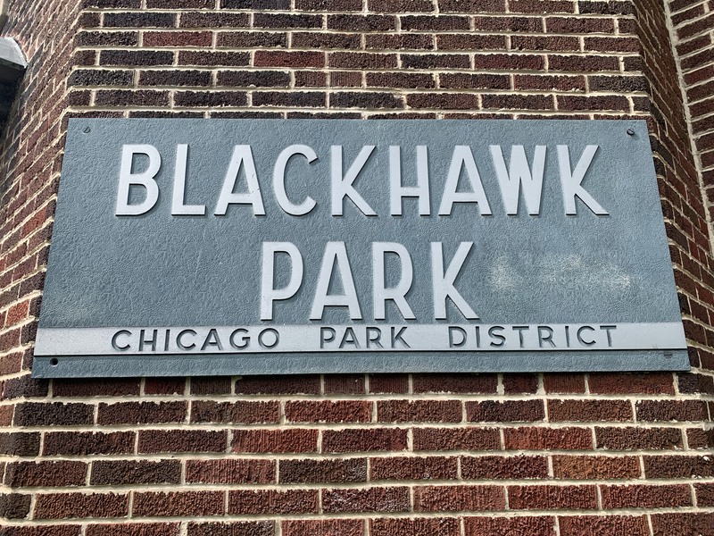 Blackhawk Park - PlaygroundThe playground at Blackhawk Park includes two play structures and two sets of swings. Divided by age group, the area for younger children includes a standard small play structure, a set of low monkey bars, and toddler swings. The other area includes a larger structure with larger slides and more advanced climbing elements including circular monkey bars and other swings. Both area are covered in wood chips and there are a few benches and picnic tables scattered in the general area for seating. The fieldhouse is located near the playground for bathroom access (when the building is open). A standard Chicago playground in the best sense of the term.