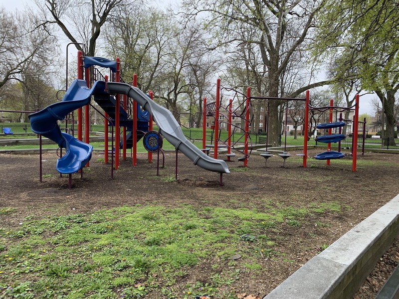 Davis (Nathan) Square Park - PlaygroundDavis Square Park, a historic park that opened in 1905 to provide social services to the neighborhood, is still open and is still providing services and amenities to the neighborhood. The playground area features a play structure and an assortment of playground equipment for climbing and traversing. Rounding out the equipment, there is a small set of swings as well as a large "four sprayer" water spray feature. There are some of the classic playground features - benches for seating, a drinking fountain, a play surface of wood chips - without any additional frills or comforts. The playground is situated near the southeast corner of the park and just south of the fieldhouse that provide bathroom access (when open). All in all, this is a normal neighborhood playground in a large and historic park.