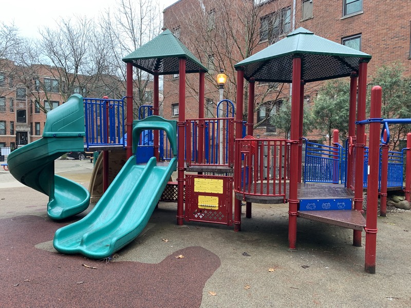Washington (George) Park - West PlaygroundThis playground - one of four in Washington Park - is located just of the Washington Park pool and is a wonderful space. The playground is quite large with multiple areas full of equipment: an open area with 'animals on springs', a sprawling and accessible play structure for younger children, a more standard structure for older children, a non-traditional set of climbing elements, swings, and a water spray feature. All in all, great play elements. The non-play elements are also high quality. The play area is fully enclosed and is shaded by large and beautiful trees. There are benches and small picnic/game tables for seating and the pavement itself is designed and imprinted with quotes and other graphics The play surface is soft rubber and the nearby pool facilities should provide access to bathrooms (when open). Really great playground - highly recommend.
